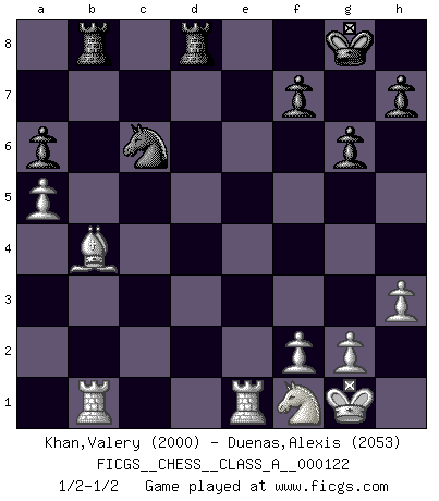 Last move : 1/2-1/2 2012 May 30 20:51:7 [Event "FICGS__CHESS__CLASS_A__000122"] [Site "FICGS"] [Date "2012.05.28"] [Round "1"] [White "Khan,Valery"] [Black "Duenas,Alexis"] [Result "1/2-1/2"] [WhiteElo "2000"] [BlackElo "2053"] 1.e4 e5 2.Nf3 Nc6 3.Bb5 a6 4.Ba4 Nf6 5.O-O Be7 6.Re1 b5 7.Bb3 d6 8.a4 Bg4 9.c3 b4 10.a5 bxc3 11.dxc3 O-O 12.h3 Bd7 13.Bc4 Qc8 14.Nh4 Re8 15.Nd2 Nd8 16.Nf1 g6 17.Nf3 Bc6 18.Ng3 Rb8 19.b4 Bb5 20.Bf1 Bxf1 21.Nxf1 Ne6 22.Bd2 c5 23.Ng5 Rd8 24.Qe2 cxb4 25.Nxe6 Qxe6 26.cxb4 d5 27.exd5 Nxd5 28.Rab1 Nxb4 29.Qxe5 Qxe5 30.Rxe5 Nc6 31.R5e1 Bb4 32.Bxb4 1/2-1/2 Ruy Lopez : Closed Kingside Castling by player White (move 5) Kingside Castling by player Black (move 11) This chess game ended in a draw. Follow this game move after move (download)After black's reply to 1.e4 with 1..e5, leaves him always trying to get into the game. (Howard Staunton) Das typische an einem Großmeister ist, daß er eine gewonnene Position schnell und schmerzlos gewinnt. (Irving Chernev) Durante una competencia de Ajedrez, un Maestro de Ajedrez deberá ser una combinación de presa de caza y un Monge. (Alexander Alekhine) J'ai vu le vaincu d'Echecs jouer des années durant dans l'espoir de la fête de la victoire. Car tu es plus riche de ce qu'elle existe si même elle n'est point pour toi. Ainsi de la perle du fond des mers. (Antoine de Saint-Exupéry) Without deviation from the norm, progress is not possible. (Frank Zappa)