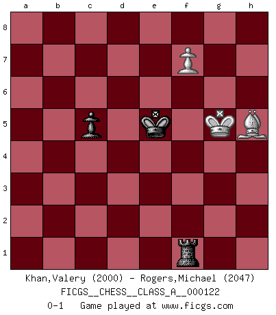 Last move : 0-1 2012 August 21 7:35:29 [Event "FICGS__CHESS__CLASS_A__000122"] [Site "FICGS"] [Date "2012.05.28"] [Round "1"] [White "Khan,Valery"] [Black "Rogers,Michael"] [Result "0-1"] [WhiteElo "2000"] [BlackElo "2047"] 1.e4 e5 2.Nf3 Nc6 3.Bb5 f5 4.Nc3 Nd4 5.Ba4 c6 6.O-O d6 7.exf5 Ne7 8.Nxd4 exd4 9.Qh5+ Kd7 10.f6 gxf6 11.Ne2 Qe8 12.Qf3 Kc7 13.Nxd4 Ng6 14.Qc3 Qe5 15.d3 Qc5 16.Qxc5 dxc5 17.Ne2 a5 18.Bb3 a4 19.Bf7 Bd6 20.a3 Bd7 21.Bh6 Ne5 22.Ba2 b5 23.Ng3 b4 24.Bg7 Rhb8 25.axb4 cxb4 26.Bxf6 Ng4 27.Bg7 b3 28.Bb1 Rg8 29.Bc3 h5 30.Ne4 Nxh2 31.Nxd6 Nxf1 32.Nc4 Bh3 33.Be5+ Kb7 34.Kxf1 Rxg2 35.Ke2 Bg4+ 36.Kf1 Bh3 37.cxb3 Rf8 38.Ke1 Rg1+ 39.Ke2 Bg4+ 40.Ke3 Be6 41.f4 Bxc4 42.Kf2 Rfg8 43.bxc4 h4 44.Rxa4 h3 45.Rb4+ Ka6 46.Ra4+ Kb6 47.Rb4+ Ka5 48.Rb7 R8g2+ 49.Ke3 h2 50.Bc3+ Ka6 51.Rh7 h1=Q 52.Rxh1 Rxh1 53.Kf3 Rgh2 54.Ba2 Rd1 55.Ke3 c5 56.Bb3 Rh3+ 57.Ke4 R1xd3 58.f5 Kb6 59.Kf4 Rh4+ 60.Kg5 Re4 61.Kf6 Rde3 62.Kg7 Kc6 63.Ba4+ Kd6 64.Bb5 Rf3 65.Kf6 Re2 66.Ba4 Re6+ 67.Kg5 Re4 68.Bd1 Rxc3 69.bxc3 Ke5 70.Bh5 Rf4 71.Bg4 Rxc4 72.Bh5 Rxc3 73.f6 Rc1 74.f7 Rf1 0-1 Ruy Lopez : Schliemann defense, Berger variation Kingside Castling by player White (move 6) Promotion Queen by player Black (move 51) 10 pieces endgame at move 57 : White KBBPPP , Black KRRP WHITE : King + 2 Bishops 3 Pawns BLACK : King + 2 Rooks 1 Pawn 9 pieces endgame at move 68 : White KBPPP , Black KRRP WHITE : King + 1 Bishop 3 Pawns BLACK : King + 2 Rooks 1 Pawn 8 pieces endgame at move 69 : White KBPPP , Black KRP WHITE : King + 1 Bishop 3 Pawns BLACK : King + 1 Rook 1 Pawn 7 pieces endgame at move 71 : White KBPP , Black KRP WHITE : King + 1 Bishop 2 Pawns BLACK : King + 1 Rook 1 Pawn 6 pieces endgame at move 72 : White KBP , Black KRP WHITE : King + 1 Bishop 1 Pawn BLACK : King + 1 Rook 1 Pawn Player Black won this chess game. Follow this game move after move (download)First-class players lose to second-class players because second-class players sometimes play a first-class game. (Siegbert Tarrasch) Die Auseinandersetzung mit Karpow war politisch geprägt. Er stand für das kommunistische System, wurde von dessen Repräsentanten gehätschelt. Ich war der Oppositionelle. Jeder Schachweltmeister spiegelt auch die gesellschaftlichen Verhältnisse wider. Kramnik steht für die Börsen-Generation des Neuen Markts, ideologiefrei, zahlenfixiert. (Garry Kasparov) Es el objetivo de la escuela moderna no tratar cada posición de acuerdo a una regla general, sino de acuerdo al principio inherente en la posición. (Richard Reti) Je ne suis pas le dernier à jouer lâchement des coups douteux pendant le zeïtnot de l'adversaire pour l'achever: en effet les coups qui font le plus peur sont ceux que l'on ne comprend pas. Je me fais souvent peur quand je joue. (Un professeur anonyme) Every man's memory is his private literature. (Aldous Huxley)