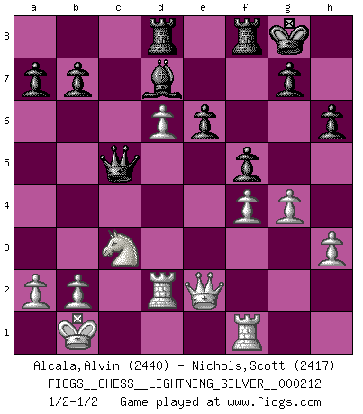Last move : 1/2-1/2 2012 May 28 19:44:50 [Event "FICGS__CHESS__LIGHTNING_SILVER__000212"] [Site "FICGS"] [Date "2012.05.28"] [Round "1"] [White "Alcala,Alvin"] [Black "Nichols,Scott"] [Result "1/2-1/2"] [WhiteElo "2440"] [BlackElo "2417"] 1.e4 c6 2.d4 d5 3.e5 c5 4.dxc5 e6 5.Be3 Ne7 6.Nf3 Nf5 7.Bg5 Qc7 8.g4 Ne7 9.c4 Ng6 10.cxd5 Bxc5 11.Nc3 O-O 12.Be2 h6 13.d6 Qc6 14.Be3 Nd7 15.Rf1 Ndxe5 16.Nxe5 Nxe5 17.Bxc5 Qxc5 18.f4 Nc6 19.Qd2 Nd4 20.O-O-O Nxe2+ 21.Qxe2 Bd7 22.Kb1 Rad8 23.Rd2 f5 24.h3 1/2-1/2 Caro-Kann : Advance variation Kingside Castling by player Black (move 11) Queenside Castling by player White (move 20) This chess game ended in a draw. Follow this game move after move (download)The beauty of a move lies not in its' appearance but in the thought behind it. (Siegbert Tarrasch) Um dein Spiel zu verbessern musst du zuallererst das Endspiel studieren, denn diese kann unabhängig studiert werden. Die Eröffnung und das Mittelspiel müssen immer in Bezug gesetzt werden zum Endspiel. (José Raúl Capablanca) Ciertamente el estado mental actual de Bobby Fischer es una tragedia. Uno de los mas grandes jugadores de Ajedrez del mundo -el orgullo y pena del Ajedrez Americano. (Frank Brady) La tactique est l'élément le plus important du milieu de jeu. (Siegbert Tarrasch) Ah, beer! The cause of, and the solution to, all of life's problems. (Homer Simpson)