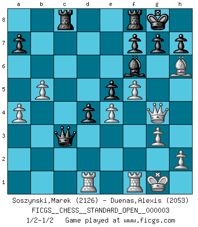 Last move : 1/2-1/2 2012 June 3 13:58:4 [Event "FICGS__CHESS__STANDARD_OPEN__000003"] [Site "FICGS"] [Date "2012.05.29"] [Round "1"] [White "Soszynski,Marek"] [Black "Duenas,Alexis"] [Result "1/2-1/2"] [WhiteElo "2126"] [BlackElo "2053"] 1.Nf3 d5 2.c4 e6 3.g3 Nf6 4.Bg2 Be7 5.O-O O-O 6.b3 c5 7.e3 Nc6 8.Qe2 dxc4 9.bxc4 e5 10.d3 Bf5 11.e4 Bg4 12.Qd2 Nd4 13.Nxd4 cxd4 14.f4 Bd7 15.Qe2 Ng4 16.Na3 Qa5 17.Nc2 b5 18.cxb5 Rac8 19.a4 Qc3 20.Bf3 Qxc2 21.Bxg4 Bxg4 22.Qxg4 Qc3 23.f5 Qxd3 24.Bh6 Bf6 25.Rad1 Qc3 1/2-1/2 Reti Opening Kingside Castling by player White (move 5) Kingside Castling by player Black (move 5) This chess game ended in a draw. Follow this game move after move (download)Only the player with the initiative has the right to attack. (Wilhelm Steinitz) Wie gewinnt Tal? Er entwickelt alle seine Figuren in die Brettmitte und opfert sie dann irgendwo. (Robert James Fischer) Siempre es mejor sacrificar los hombres de tu oponente. (Savielly Tartakower) Le thème de l'attaque double intervient d'une manière ou d'une autre dans l'immense majorité des combinaisons. (Youri Averbakh) Some people are so afraid to die that they never begin to live. (Henry Van Dyke)