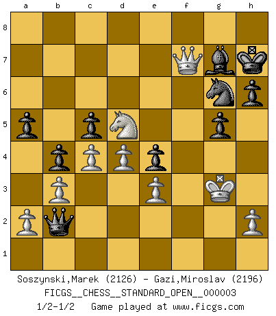 Last move : 1/2-1/2 2012 October 13 22:56:44 [Event "FICGS__CHESS__STANDARD_OPEN__000003"] [Site "FICGS"] [Date "2012.05.29"] [Round "2"] [White "Soszynski,Marek"] [Black "Gazi,Miroslav"] [Result "1/2-1/2"] [WhiteElo "2126"] [BlackElo "2196"] 1.Nf3 Nf6 2.c4 c5 3.b3 g6 4.Bb2 Bg7 5.g3 d6 6.Bg2 e5 7.Nc3 O-O 8.O-O Nc6 9.d3 h6 10.Nd2 Be6 11.Nde4 Rb8 12.Nxf6+ Bxf6 13.Nd5 Bg7 14.Qd2 Qd7 15.f4 f5 16.Rae1 Kh7 17.e3 b5 18.Bc3 b4 19.Bb2 Rbe8 20.fxe5 dxe5 21.Rf2 g5 22.Rd1 a5 23.Qe2 Rf7 24.g4 Ref8 25.Nb6 Qd6 26.gxf5 Bxf5 27.Rdf1 Ne7 28.Nd5 Ng6 29.Be4 Qe6 30.Bxf5 Rxf5 31.Rxf5 Rxf5 32.Rxf5 Qxf5 33.Qf1 Qg4+ 34.Qg2 Qd1+ 35.Qf1 Qc2 36.Qf7 Qb1+ 37.Kg2 Qxb2+ 38.Kg3 e4 39.d4 1/2-1/2 Reti Opening Kingside Castling by player Black (move 7) Kingside Castling by player White (move 8) This chess game ended in a draw. Follow this game move after move (download)Some part of a mistake is always correct. (Savielly Tartakover) Schach ist Kampf, hauptsächlich jedoch gegen die eigenen Fehler. (Savielly Grigorievitsch Tartakower) Yo jugué Ajedrez con el y a veces le pude haber ganado solo que siempre devuelve su última jugada y juega la partida de manera diferente. (Mark Twain) Les Echecs sont et restent toujours un combat, un combat intégral comme la boxe, la lutte ou un autre sport, et où il doit y avoir un vainqueur et un vaincu. (Joseph Emil Diemer) CHESS, n. f. [echecs, Fr.] A nice and abstruse game, in which two sets of puppets are moved in opposition to each other. (Dr Samuel Johnson, A Dictionary Of The English Language, 1755)