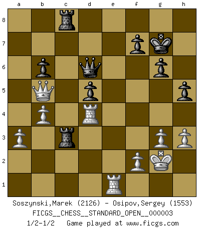 Last move : 1/2-1/2 2012 June 10 4:41:45 [Event "FICGS__CHESS__STANDARD_OPEN__000003"] [Site "FICGS"] [Date "2012.05.29"] [Round "1"] [White "Soszynski,Marek"] [Black "Osipov,Sergey"] [Result "1/2-1/2"] [WhiteElo "2126"] [BlackElo "1553"] 1.Nf3 c5 2.c4 Nf6 3.b3 g6 4.Bb2 Bg7 5.g3 O-O 6.Bg2 Nc6 7.O-O Qa5 8.Nc3 d6 9.d4 cxd4 10.Nxd4 Bd7 11.e3 Rab8 12.Re1 h5 13.h3 a6 14.Rc1 Rfc8 15.Qe2 e6 16.a3 Nxd4 17.exd4 Qd8 18.b4 Bc6 19.Rcd1 Bxg2 20.Kxg2 b6 21.c5 Qc7 22.cxd6 Qxd6 23.d5 Nxd5 24.Nxd5 exd5 25.Bxg7 Kxg7 26.Qxa6 Rc3 27.Rd4 Rbc8 28.Qb5 1/2-1/2 Reti Opening Kingside Castling by player Black (move 5) Kingside Castling by player White (move 7) This chess game ended in a draw. Follow this game move after move (download)Examine moves that smite! A good eye for smites is far more important than a knowledge of strategical principles. (Purdy) Ich bin es gewohnt, das die Jugend mir überhaupt keinen Respekt entgegenbringt. (Alexander Morozewich) Una compensación adecuada por un sacrificio es tener una combinación sólida que conduce a una posición ganadora; una compensación adecuada por una metida de pata es dejar a tu oponente arrebatar una derrota de las fauces de la victoria. (Bruce A. Moon) La tactique, c'est ce que vous faites quand il y a quelque chose à faire; la stratégie, c'est ce que vous faites quand il n'y a rien à faire. (Savielli Tartacower) Chess is as much a mystery as women. (Purdy)