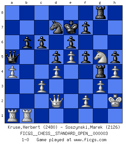 Last move : 1-0 2012 August 2 9:3:29 [Event "FICGS__CHESS__STANDARD_OPEN__000003"] [Site "FICGS"] [Date "2012.05.29"] [Round "1"] [White "Kruse,Herbert"] [Black "Soszynski,Marek"] [Result "1-0"] [WhiteElo "2480"] [BlackElo "2126"] 1.e4 c6 2.d4 d5 3.e5 g6 4.Nf3 h5 5.Nc3 Nh6 6.Bd3 Bf5 7.O-O Nd7 8.Ne2 e6 9.a4 a5 10.Bg5 Qb6 11.c3 Bxd3 12.Qxd3 Nf5 13.Ng3 Be7 14.Nxf5 gxf5 15.Bxe7 Kxe7 16.Qd2 Rag8 17.b4 Qc7 18.bxa5 Qxa5 19.Rfb1 b6 20.h4 Rg6 21.Ng5 Rhg8 22.g3 Rc8 23.Nh3 Rg4 24.Ng5 Rg8 25.Kh2 1-0 Caro-Kann : Advance variation Kingside Castling by player White (move 7) Player White won this chess game. Follow this game move after move (download)No one ever won a game by resigning. (Unknown) Ich hatte meine größten Erfolge, als ich 47 Jahre alt war. Kasparow war noch nicht mal 42 und hat das Schach schon im Stich gelassen. (Viktor Kortschnoi) Los tropiezos estan todos ahí en el tablero, esperando que se cometan. (Savielly Tartakover) Les sacrifices démontrent seulement que quelqu'un a gaffé. (Savielly Tartacover) Perception is reality. (Immanuel Kant)