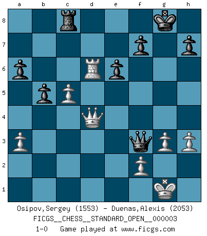 Last move : 1-0 2012 June 7 16:55:52 [Event "FICGS__CHESS__STANDARD_OPEN__000003"] [Site "FICGS"] [Date "2012.05.29"] [Round "1"] [White "Osipov,Sergey"] [Black "Duenas,Alexis"] [Result "1-0"] [WhiteElo "1553"] [BlackElo "2053"] 1.d4 d5 2.c4 e6 3.Nf3 Nf6 4.Nc3 Be7 5.Bf4 O-O 6.e3 c5 7.dxc5 Bxc5 8.a3 a6 9.Qc2 Bd6 10.Bg5 dxc4 11.Rd1 Qc7 12.Bxf6 gxf6 13.Bxc4 Nd7 14.Bd3 f5 15.Qd2 Be7 16.O-O Rd8 17.e4 Nc5 18.Qe2 Rxd3 19.Rxd3 Nxd3 20.Qxd3 fxe4 21.Nxe4 Qf4 22.Rd1 b5 23.g3 Qh6 24.Ne5 Bb7 25.Qf3 Rf8 26.Rd7 Bxe4 27.Qxe4 Bf6 28.Rc7 Qg7 29.Nd7 Rd8 30.b4 Bb2 31.Qh4 Re8 32.Nc5 Qf6 33.Qg4+ Qg6 34.Qe2 Bd4 35.Rd7 Bxc5 36.bxc5 Rc8 37.Qb2 Qe4 38.h3 Qc6 39.Qd4 Qf3 40.Rd6 1-0 Queen's gambit declined Kingside Castling by player Black (move 5) Kingside Castling by player White (move 16) Player White won this chess game. Follow this game move after move (download)When in doubt... play Chess ! (Tevis) Zum Sieg gelangt man nicht, wenn man gut, sondern nur wenn man besser spielt (Savielly Grigorievitsch Tartakower) El Ajedrez es un juego de pelea el cual es puramente intelectual e incluye la suerte. (Richard Reti) Je menace de comprendre la position. (Anonyme) The good fighters of old first put themselves beyond the possibility of defeat, and then waited for an opportunity of defeating the enemy. (Sun Tzu)