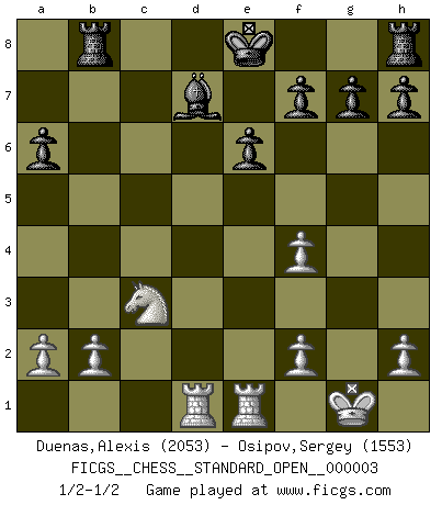 Last move : 1/2-1/2 2012 June 1 16:36:45 [Event "FICGS__CHESS__STANDARD_OPEN__000003"] [Site "FICGS"] [Date "2012.05.29"] [Round "2"] [White "Duenas,Alexis"] [Black "Osipov,Sergey"] [Result "1/2-1/2"] [WhiteElo "2053"] [BlackElo "1553"] 1.d4 d5 2.c4 e6 3.Nc3 Nf6 4.Bf4 c5 5.e3 Nc6 6.Nf3 cxd4 7.exd4 dxc4 8.Bxc4 Bd6 9.Be5 Bxe5 10.dxe5 Qxd1+ 11.Rxd1 Ng4 12.Bb5 Bd7 13.O-O Ncxe5 14.Nxe5 Nxe5 15.Rfe1 a6 16.Bxa6 Nf3+ 17.gxf3 bxa6 18.f4 Rb8 1/2-1/2 QGD : Harrwitz attack Kingside Castling by player White (move 13) This chess game ended in a draw. Follow this game move after move (download)Chess teaches you to control the initial excitement you feel when you see something that looks good and it trains you to think objectively when you're in trouble. (Stanley Kubrick) Weshalb minderdergeübte Spieler mit g2-g4 beginnen? Die betreffenden sind unschlüssig, ob sie nun rechts (h4) oder links (f4) beginnen sollen, und in ihrer Ratlosigkeit entschliessen sie sich nach guter Bürgerart dazu, den goldenen Mittelweg zu wählen. (Aaron Nimzowitsch) Cuando me preguntan: -¿Cual es el secreto que te hace hacer mejores movidas que tus oponentes?, Yo respondo: Me da gusto que me pregunten eso, porque, como veran, hay una simple razón. Yo pienso mis propias movidas y dejo a mi oponente que el piense las suyas. (Alexander Alekhine) J'ai vu le vaincu d'Echecs jouer des années durant dans l'espoir de la fête de la victoire. Car tu es plus riche de ce qu'elle existe si même elle n'est point pour toi. Ainsi de la perle du fond des mers. (Antoine de Saint-Exupéry) If I had no sense of humor, I would long ago have committed suicide. (Mahatma Gandhi)