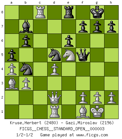 Last move : 1/2-1/2 2012 September 13 7:50:30 [Event "FICGS__CHESS__STANDARD_OPEN__000003"] [Site "FICGS"] [Date "2012.05.29"] [Round "1"] [White "Kruse,Herbert"] [Black "Gazi,Miroslav"] [Result "1/2-1/2"] [WhiteElo "2480"] [BlackElo "2196"] 1.d4 Nf6 2.c4 e6 3.Nc3 Bb4 4.Qc2 O-O 5.a3 Bxc3+ 6.Qxc3 b6 7.Nf3 Bb7 8.e3 d5 9.b3 Nbd7 10.Be2 c5 11.O-O Rc8 12.Bb2 cxd4 13.exd4 Ba6 14.a4 dxc4 15.Bxc4 Nd5 16.Qd3 Nb4 17.Qe2 Bb7 18.Rac1 a5 19.Ba3 Nf6 20.Ne5 Re8 21.Rfd1 Nfd5 22.Qd2 Qf6 23.Bf1 Qf5 24.Rxc8 1/2-1/2 Nimzo-Indian : Classical variation Kingside Castling by player Black (move 4) Kingside Castling by player White (move 11) This chess game ended in a draw. Follow this game move after move (download)Fischer is under obligation to nobody. (Joseph Platz) Ein bischen Romantik kann weder im Schach noch in der Liebe schaden. Also versuche ich mich ab und zu daran zu erinnern. (Nigel Short) Botvinnik trataba de restarle el misterio al Ajedrez, siempre relacionandolo a situaciones de la vida ordinaria. El gustaba de llamar al Ajedrez un típico problema inexacto similar a aquellos de los cuales la gente siempre tiene que enfrentarse en la vida cotidiana. (Garry Kasparov) Nous vivons dans un monde échiquéen : chaque jour qui passe est un défi à relever. (Philosophe Sasha) All art requires courage. (Anne Tucker)