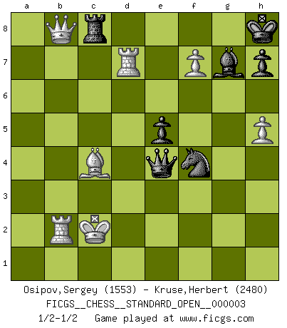 Last move : 1/2-1/2 2012 July 29 18:18:30 [Event "FICGS__CHESS__STANDARD_OPEN__000003"] [Site "FICGS"] [Date "2012.05.29"] [Round "1"] [White "Osipov,Sergey"] [Black "Kruse,Herbert"] [Result "1/2-1/2"] [WhiteElo "1553"] [BlackElo "2480"] 1.e4 c5 2.Nf3 d6 3.d4 cxd4 4.Nxd4 Nf6 5.Nc3 a6 6.Be3 e5 7.Nb3 Be6 8.f3 Be7 9.Qd2 O-O 10.O-O-O Nbd7 11.g4 b5 12.g5 b4 13.Ne2 Ne8 14.f4 a5 15.f5 a4 16.Nbd4 exd4 17.Nxd4 b3 18.Kb1 bxc2+ 19.Nxc2 Bb3 20.axb3 axb3 21.Na3 Ne5 22.h4 Ra4 23.Qg2 Qa8 24.Bd4 Nc7 25.h5 Rb8 26.f6 Bf8 27.g6 Ne6 28.Bxe5 dxe5 29.Rd7 Nf4 30.Qf3 Rxa3 31.bxa3 Qxa3 32.gxf7+ Kh8 33.fxg7+ Bxg7 34.Rh2 Rc8 35.Rb2 Ra8 36.Qxb3 Qa1+ 37.Kc2 Rc8+ 38.Bc4 Qe1 39.Qb8 Qxe4+ 40.Kd1 Qh1+ 41.Kc2 Qe4+ 42.Kd1 Qh1+ 43.Kc2 Qe4+ 1/2-1/2 Sicilian : Najdorf, Byrne (English) attack Kingside Castling by player Black (move 9) Queenside Castling by player White (move 10) This chess game ended in a draw. Follow this game move after move (download)Let the perfectionist play postal. (Yasser Seirawan) Der Vorposten provoziert a) eine Basis für neue Angriffe und b) eine Schwächung der gegnerischen Widerstandskraft in der fraglichen Linie. (Aaron Nimzowitsch) Yo jugué Ajedrez con el y a veces le pude haber ganado solo que siempre devuelve su última jugada y juega la partida de manera diferente. (Mark Twain) Avant la finale, les dieux ont créé le milieu de partie. (Tarrasch) Crush them ! Make them suffer ! (General Grievous in Star Wars ep.3)