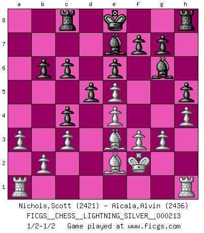 Last move : 1/2-1/2 2012 May 29 18:24:40 [Event "FICGS__CHESS__LIGHTNING_SILVER__000213"] [Site "FICGS"] [Date "2012.05.29"] [Round "1"] [White "Nichols,Scott"] [Black "Alcala,Alvin"] [Result "1/2-1/2"] [WhiteElo "2421"] [BlackElo "2436"] 1.d4 Nf6 2.Nf3 d5 3.Bf4 c5 4.e3 Nc6 5.c3 Qb6 6.Qb3 c4 7.Qxb6 axb6 8.Na3 Na7 9.Nc2 Bf5 10.Nb4 e6 11.a3 Nb5 12.Ne5 Nd7 13.f3 Nxe5 14.dxe5 Rc8 15.Be2 Na7 16.h4 h5 17.Kf2 Nc6 18.Nxc6 bxc6 19.e4 Bg6 20.Be3 Be7 21.g3 1/2-1/2 Queen's pawn game This chess game ended in a draw. Follow this game move after move (download)The passion for playing Chess is one of the most unaccountable in the world. (H.G. Wells) Dieses schreckliche Gefühl, dass ich gegen eine Maschine spielte, die niemals Fehler macht, zerschmetterte meinen Widerstand. (Mark Taimanov) Observen a Garry Kasparov. Después de una derrota, invariablemente el gana la próxima partida. Prácticamente hace pedazos a su siguiente oponente. Eso es algo que tenemos que aprender a lograr. (Maurice Ashley) Celui qui prend des risques peut perdre, celui qui n'en prend pas perd toujours. (Xavier Tartacover) Somewhere in the world there is an epigram for every dilemma. (Hendrik Willem van Loon)