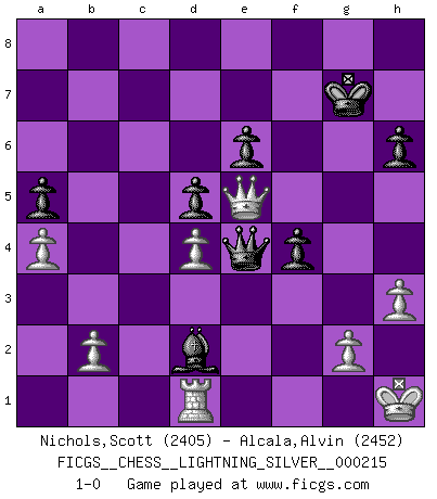 Last move : 1-0 2012 May 30 18:50:50 [Event "FICGS__CHESS__LIGHTNING_SILVER__000215"] [Site "FICGS"] [Date "2012.05.30"] [Round "1"] [White "Nichols,Scott"] [Black "Alcala,Alvin"] [Result "1-0"] [WhiteElo "2405"] [BlackElo "2452"] 1.e4 c5 2.Nf3 e6 3.d4 cxd4 4.Nxd4 a6 5.Bd3 Bc5 6.Nb3 Be7 7.Qg4 g6 8.Qe2 d6 9.O-O Nc6 10.Nc3 Ne5 11.f4 Nxd3 12.cxd3 Nf6 13.e5 Nd5 14.Nxd5 exd5 15.exd6 Qxd6 16.Re1 Be6 17.f5 gxf5 18.Qf2 Rc8 19.Nd4 Rg8 20.Re2 Rg6 21.Be3 Qe5 22.Kh1 Qf6 23.Bf4 Kf8 24.Nxe6+ fxe6 25.Qa7 Re8 26.Rf1 Kg8 27.Qxb7 Qf7 28.Rc1 Bd8 29.Qb8 Qd7 30.Rc8 Kf7 31.Rec2 a5 32.h3 R6g8 33.R8c6 Qe7 34.Bd6 Qh4 35.Re2 Rg7 36.Qb7+ Kg8 37.Qb5 Qh5 38.Rc8 h6 39.Be5 Qxe2 40.Qxe8+ Kh7 41.Bxg7 Kxg7 42.Qd7+ Kg6 43.Rc1 Bg5 44.Rb1 Bf4 45.Qe8+ Kg7 46.Qe7+ Kg6 47.d4 Bd2 48.a4 Qe4 49.Rf1 Bg5 50.Qe8+ Kg7 51.Qb8 Bd2 52.Rd1 f4 53.Qe5+ 1-0 Sicilian : Kan, Polugaievsky variation Kingside Castling by player White (move 9) Player White won this chess game. Follow this game move after move (download)Chess is a terrible game. If you have no center, your opponent has a freer position. If you do have a center, then you really have something to worry about ! (Siegbert Tarrasch) Alle offensichtlichen Züge sehen nach dem Spiel in der Analyse verdächtig aus. (Viktor Kortschnoi) Existen dos clases de sacrificios: los correctos y los míos. (Mikhail Tal) D'abord les bases : Jouez et étudiez, puis étudiez et jouez, ensuite jouez et étudiez, puis étudiez et jouez. Deuxièmement : Donnez toujours le meilleur de vous-même ! (Ken Smith) But they are useless. They can only give you answers. (Pablo Picasso, about computers)