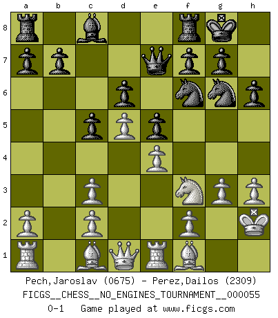 Last move : 0-1 2012 November 4 0:49:25 [Event "FICGS__CHESS__NO_ENGINES_TOURNAMENT__000055"] [Site "FICGS"] [Date "2012.05.30"] [Round "1"] [White "Pech,Jaroslav"] [Black "Perez,Dailos"] [Result "0-1"] [WhiteElo "0675"] [BlackElo "2309"] 1.e4 e5 2.Nf3 Nf6 3.Nc3 Nc6 4.Bb5 Bb4 5.O-O O-O 6.d3 d6 7.Bg5 Bxc3 8.bxc3 Qe7 9.Re1 Nd8 10.d4 Ne6 11.Bc1 Rd8 12.Bf1 c5 13.d5 Nf8 14.h3 Ng6 15.g3 h6 16.Kh2 Rf8 0-1 This chess game has been lost on time (started : 2012.05.30 21:0:34) Petrov Three knights game Kingside Castling by player White (move 5) Kingside Castling by player Black (move 5) Player Black won this chess game. Follow this game move after move (download)A thorough understanding of the typical mating continuations makes the most complicated sacrificial combinations leading up to them not only not difficult, but almost a matter of course. (Siegbert Tarrasch) Moralische Siege zählen nicht. (Savielly Grigorievitsch Tartakower) El ganador de una partida es aquel jugador que hace el penúltimo error. (Savielly Tartakover) Le génie consiste à savoir transgresser les règles au moment opportun. (Teichmann) When the going gets tactical, the computers get going. (Hyatt)