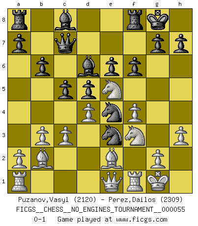 Last move : 0-1 2012 October 25 1:38:28 [Event "FICGS__CHESS__NO_ENGINES_TOURNAMENT__000055"] [Site "FICGS"] [Date "2012.05.30"] [Round "1"] [White "Puzanov,Vasyl"] [Black "Perez,Dailos"] [Result "0-1"] [WhiteElo "2120"] [BlackElo "2309"] 1.f4 d5 2.Nf3 Nf6 3.e3 e6 4.d4 c5 5.c3 Nc6 6.Be2 Bd6 7.Nbd2 O-O 8.O-O Qc7 9.Ne5 b6 10.b3 Ne7 11.h3 Nf5 12.Ndf3 Ne4 13.Bb2 Nxe3 14.Qe1 f6 0-1 This chess game has been lost on time (started : 2012.05.30 21:0:34) Bird's Opening Kingside Castling by player Black (move 7) Kingside Castling by player White (move 8) Player Black won this chess game. Follow this game move after move (download)Pawn endings are to Chess what putting is to golf. (Cecil Purdy) Fischer: 'Remis!?' Uhlmann: 'Aber es muss doch dreimal Zugwiederholung sein!' Fischer: 'Sie nehmen das Remis an, wie ich es sage, sonst spiele ich weiter und werde Sie dann schlagen!' (Robert James Fischer) Uno por uno, yo los acribillé, mi superioridad muy pronto se volvio aparente. (Jose Capablanca) Il n'y a plus de joueurs du niveau de Jacob Murray dont la seule quête est le beau jeu, le plaisir de voir les pièces construire quelque chose. Sur 10 idées à la minute, 9 seront sans intérêt, la dernière s'avèrera géniale. (Christian Bauer) Never was anything great achieved without danger. (Niccolo Machiavelli)
