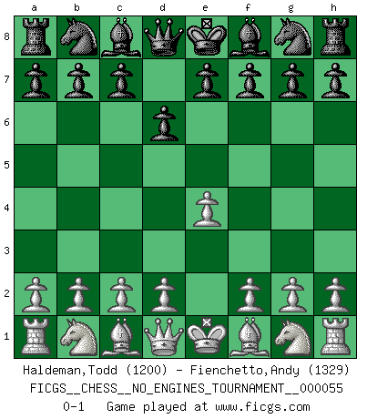 Last move : 0-1 2012 September 10 18:4:31 [Event "FICGS__CHESS__NO_ENGINES_TOURNAMENT__000055"] [Site "FICGS"] [Date "2012.05.30"] [Round "1"] [White "Haldeman,Todd"] [Black "Fienchetto,Andy"] [Result "0-1"] [WhiteElo "1200"] [BlackElo "1329"] 1.e4 d6 0-1 This chess game has been lost on time (started : 2012.05.30 21:0:34) King's pawn Opening Player Black won this chess game. Follow this game move after move (download)Mistrust is the most necessary characteristic of the Chess player. (Siegbert Tarrasch) Wenn Dein Gegner dir ein Remis anbietet, versuch herauszufinden, weshalb er glaubt schlechter zu stehen. (Nigel Short) El Ajedrez es el arte del análisis. (Mikhail Botvinnik) A ce moment-là, je menaçais de comprendre la position ! (Clément L'Heureux) Who needs drugs and alcohol if he can play Big Chess at FICGS ? (Heinz-Georg Lehnhoff)