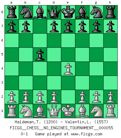 Last move : 0-1 2012 September 10 18:4:31 [Event "FICGS__CHESS__NO_ENGINES_TOURNAMENT__000055"] [Site "FICGS"] [Date "2012.05.30"] [Round "1"] [White "Haldeman,Todd"] [Black "Valentin,Laurentiu"] [Result "0-1"] [WhiteElo "1200"] [BlackElo "1557"] 1.e4 c5 0-1 This chess game has been lost on time (started : 2012.05.30 21:0:34) Sicilian defense Player Black won this chess game. Follow this game move after move (download)What is the object of playing a gambit opening?... To acquire a reputation of being a dashing player at the cost of losing a game. (Siegbert Tarrasch) Glücklicherweise sind Großmeister Ruben Fines reine Schachbücher weniger phallozentrisch [als seine Schachpsychologie] und deswegen auch weniger lächerlich. (Nigel Short) El Ajedrez, como cualquier actividad creativa, solo puede existir a través del esfuerzo combinado de aquellos que tienen talento creativo y de aquellos que poseen la habilidad de organizar su trabajo creativo. (Mikhail Botvinnik) Le profane ne songe pas à la somme de jouissance dont il se prive, qui méconnaît ce jeu aux ressources aussi variées que passionnantes. (Jean-Marie Jeanton-Lamarche) To be champion requires more than simply being a strong player; one has to be a strong human being as well. (Anatoly Karpov)