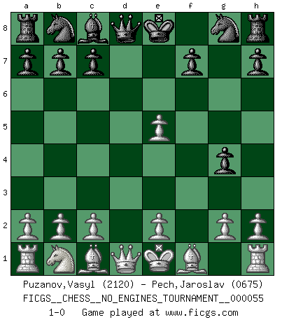 Last move : 1-0 2012 November 2 10:4:40 [Event "FICGS__CHESS__NO_ENGINES_TOURNAMENT__000055"] [Site "FICGS"] [Date "2012.05.30"] [Round "1"] [White "Puzanov,Vasyl"] [Black "Pech,Jaroslav"] [Result "1-0"] [WhiteElo "2120"] [BlackElo "0675"] 1.f4 e5 2.fxe5 d6 3.exd6 Bxd6 4.Nf3 g5 5.d4 g4 6.Ne5 Bxe5 7.dxe5 1-0 This chess game has been lost on time (started : 2012.05.30 21:0:34) Bird : From gambit, Lasker variation Player White won this chess game. Follow this game move after move (download)Chess is a terrific way for kids to build self image and self esteem. (Saudin Robovic) Rubinstein ist ein Turmendspiel, welches die Götter vor tausenden von Jahren begannen. (Savielly Grigorievitsch Tartakower) No soy una persona materialista y por eso, no resiento la falta o pérdida del dinero. La ausencia de cosas mundanas carece de importancia. Ya que el Ajedrez es una forma en la que puedo ser tan materialista como yo desee sin tener la necesidad de vender mi alma. (Jamie Walter Adams) Le temps de noter son nom sur la feuille de partie, j'étais déjà en zeitnot ! D'un modeste amateur apparié lors de la première ronde d'un open contre le grand-maître Azmaïparashvili. In God we trust, all others we virus scan. (Anonymous)