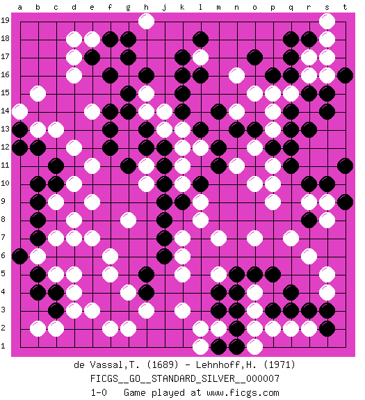 Last move : 1-0 2013 February 4 0:27:47 [Event "FICGS__GO__STANDARD_SILVER__000007"] [Site "FICGS"] [Date "2012.05.30"] [Round "1"] [Black "de Vassal,Thibault"] [White "Lehnhoff,Heinz-Georg"] [Result "1-0"] [Rating 1 "1689"] [Rating 2 "1971"] 1.q4 d16 2.q17 d4 3.q11 n16 4.k16 q15 5.r15 o3 6.q16 n14 7.g17 r6 8.p5 q2 9.r8 q7 10.n5 o7 11.m3 p9 12.r3 r9 13.o11 l17 14.k17 m7 15.m11 k3 16.m4 k5 17.l16 m13 18.l13 p13 19.q14 p15 20.q13 l12 21.m12 p14 22.n13 k12 23.m14 e18 24.c3 d3 25.c4 c5 26.b5 b6 27.b4 c2 28.c6 d5 29.b7 c7 30.d6 d7 31.e6 e7 32.b8 f6 33.e5 f5 34.e4 e3 35.f4 g4 36.f3 f2 37.g3 g2 38.h4 h3 39.a6 b2 40.c11 c13 41.b12 h19 42.l18 r14 43.r13 r16 44.s14 r17 45.r18 s18 46.q18 r2 47.s2 s4 48.s3 e11 49.d9 b13 50.l10 s5 51.p3 p2 52.q3 e9 53.j10 s16 54.s15 l2 55.n2 m2 56.n3 o2 57.m1 o4 58.o5 d10 59.c10 s19 60.t16 p10 61.h12 k13 62.k14 j13 63.g14 j14 64.k15 k10 65.k9 g13 66.h13 k11 67.j8 l9 68.g18 h11 69.j11 h15 70.g15 g16 71.h16 h14 72.f16 g12 73.j12 p11 74.p12 o12 75.q12 h10 76.j9 s17 77.p16 n11 78.o13 o10 79.e17 d17 80.a13 a14 81.a12 o15 82.o17 e14 83.r10 s9 84.s10 d12 85.b10 c9 86.b9 l8 87.j6 t10 88.t11 b15 89.t9 s8 90.f18 d18 91.h5 d8 92.f13 g8 93.f14 k7 94.j7 k6 95.f12 o1 96.n1 l1 97.g11 m5 98.n4 1-0 Here are the names of the openings (joseki) played in the four corners : Corner q4 : q4 o3 Hoshi (Hwajeom, Seongjeom, Xingwei`) 4-4 Point. The star or hoshi (4-4) point, emphasizing influence at the potential expense of territory. Ikken Kakari (Hankan Keolch'im, Yi Gua`jiao~, 1-Space Low Approach). White 2 is the standard approach move to the 4-4. Corner d16 : d16 g17 Hoshi (Hwajeom, Seongjeom, Xingwei`) 4-4 Point. The star or hoshi (4-4) point, emphasizing influence at the potential expense of territory. Niken Kakari (Dukan Keolch'im, E`r Gua`jiao~, 2-Space Low Approach). White typically answers by 7-3 or 3-5 (which is not joseki). Corner d4 : d4 c3 Hoshi (Hwajeom, Seongjeom, Xingwei`) 4-4 Point. The star or hoshi (4-4) point, emphasizing influence at the potential expense of territory. Player Black won this Go (weiqi, baduk) game. Follow this game move after move (download)A meijin needs no joseki. (Anonymous) Memory is a way of holding onto the things you love, the things you are, the things you never want to lose. (from the television show: The Wonder Years)