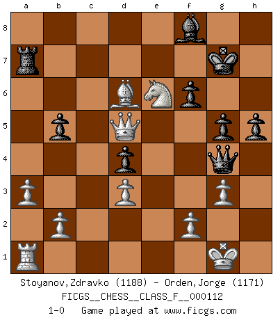Last move : 1-0 2012 November 6 21:46:40 [Event "FICGS__CHESS__CLASS_F__000112"] [Site "FICGS"] [Date "2012.06.01"] [Round "1"] [White "Stoyanov,Zdravko"] [Black "Orden,Jorge"] [Result "1-0"] [WhiteElo "1188"] [BlackElo "1171"] 1.e4 c5 2.Nf3 d6 3.h3 Nf6 4.c3 e6 5.a3 Be7 6.Be2 O-O 7.e5 dxe5 8.Nxe5 b6 9.Bf3 Nd5 10.c4 f6 11.Ng4 Bb7 12.cxd5 Bxd5 13.Nc3 Nc6 14.d3 a6 15.Bxd5 exd5 16.O-O Qd6 17.Qf3 Nd4 18.Qd1 Rfe8 19.Re1 Nc6 20.g3 Bf8 21.Na4 b5 22.Nc3 Re7 23.Bd2 h5 24.Nh2 Rae8 25.Nf3 Ne5 26.Nxe5 Rxe5 27.Rxe5 Qxe5 28.Bf4 Qf5 29.Qf3 d4 30.Nd5 Qxh3 31.Nc7 Re7 32.Nxa6 g5 33.Bd6 Ra7 34.Qd5+ Kg7 35.Nxc5 Qg4 36.Ne6+ 1-0 Sicilian Kingside Castling by player Black (move 6) Kingside Castling by player White (move 16) Player White won this chess game. Follow this game move after move (download)I'm not afraid of Spassky. The world knows I'm the best. You don't need a match to prove it. (Bobby Fischer) Fischer: 'Remis!?' Uhlmann: 'Aber es muss doch dreimal Zugwiederholung sein!' Fischer: 'Sie nehmen das Remis an, wie ich es sage, sonst spiele ich weiter und werde Sie dann schlagen!' (Robert James Fischer) Aunque la mayoría de la gente disfruta observar las partidas de los grandes Maestros de ataque, algunos de los jugadores mas notables en la historia han sido los jugadores silenciosos posicionales. Lentamente ellos te aplastan despojandote de tu espacio, congestionando tus piezas y dejandote virtualmente sin nada que hacer. (Yasser Seirawan) Avant la finale, les dieux ont créé le milieu de partie. (Tarrasch) Knowledge rests not upon truth alone, but upon error also. (Carl G. Jung)