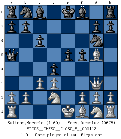 Last move : 1-0 2012 December 9 0:25:15 [Event "FICGS__CHESS__CLASS_F__000112"] [Site "FICGS"] [Date "2012.06.01"] [Round "1"] [White "Salinas,Marcelo"] [Black "Pech,Jaroslav"] [Result "1-0"] [WhiteElo "1160"] [BlackElo "0675"] 1.e4 c6 2.Qh5 d5 3.Nc3 Nf6 4.Qh4 d4 5.e5 Ng4 6.Ne4 Nxe5 7.d3 Ng6 8.Qg3 e5 9.Bg5 Qa5+ 10.c3 f5 11.Nd2 1-0 Caro-Kann defense Player White won this chess game. Follow this game move after move (download)At this time Fischer is simply a level above all the best Chessplayers in the world. (John Jacobs) Ich habe Kasparov in Rente geschickt. (Veselin Topalov) Todos los Maestros de Ajedrez fueron un día unos principiantes. (Chernev) Le système Elo représente seulement une moyenne. Il est simplement un indicateur de votre stabilité. (Anatoli Karpov) The general who wins the battle makes many calculations in his temple before the battle is fought. The general who loses makes but few calculations beforehand. (Sun Tzu)