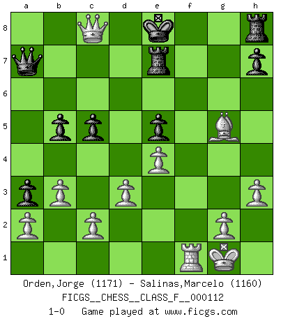 Last move : 1-0 2012 November 1 9:12:44 [Event "FICGS__CHESS__CLASS_F__000112"] [Site "FICGS"] [Date "2012.06.01"] [Round "1"] [White "Orden,Jorge"] [Black "Salinas,Marcelo"] [Result "1-0"] [WhiteElo "1171"] [BlackElo "1160"] 1.e4 Nc6 2.Nf3 e5 3.Nc3 d6 4.Be2 Nd4 5.d3 Bg4 6.h3 Bxf3 7.Bxf3 Nf6 8.O-O c6 9.Be3 Nxf3+ 10.Qxf3 a5 11.Qg3 a4 12.b3 a3 13.f4 Qa5 14.fxe5 dxe5 15.Na4 Nd7 16.Rf2 b5 17.Bd2 Qa7 18.Be3 c5 19.Nc3 Rb8 20.Raf1 f6 21.Nd5 g5 22.Nxf6+ Kd8 23.Nxd7 Kxd7 24.Rf7+ Be7 25.Qg4+ Ke8 26.Bxg5 Rb7 27.Rxe7+ Rxe7 28.Qc8+ 1-0 KP : Nimzovich defense Kingside Castling by player White (move 8) Player White won this chess game. Follow this game move after move (download)A sacrifice is best refuted by accepting it. (Wilhelm Steinitz) Kasparov stellt für gewöhnlich die Regeln auf und bricht sie dann selbst wieder. (Alexej Shirov) Hay jugadores fuertes y personas amables y yo soy un jugador fuerte. (Bobby Fischer) Il vaut toujours mieux jouer un plan faux de façon logique que de n'avoir pas de plan du tout. (Victor Kortchnoï) Humor is by far the most significant activity of the human brain. (Edward De Bono)