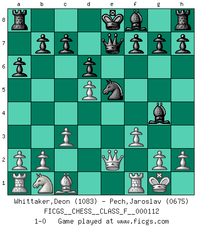 Last move : 1-0 2012 November 23 11:1:22 [Event "FICGS__CHESS__CLASS_F__000112"] [Site "FICGS"] [Date "2012.06.01"] [Round "1"] [White "Whittaker,Deon"] [Black "Pech,Jaroslav"] [Result "1-0"] [WhiteElo "1083"] [BlackElo "0675"] 1.e4 e5 2.Nf3 Nc6 3.c3 Nf6 4.Bb5 Nxe4 5.Qe2 Nd6 6.Nxe5 Qe7 7.d4 Nxb5 8.Qxb5 d6 9.d5 a6 10.Qe2 Nxe5 11.O-O Bg4 12.f3 1-0 This chess game has been lost on time (started : 2012.06.01 18:58:35) Ponziani : Jaenisch counter-attack Kingside Castling by player White (move 11) Player White won this chess game. Follow this game move after move (download)It is difficult to play against Einstein's theory --on his first loss to Fischer. (Mikhail Tal) Die FIDE ist dabei in die Hände der russischen Mafia zu fallen. (Larry Evans) Por esta medida (el intervalo entre Fischer y sus contemporaneos), yo le considero el mas grande campeón mundial. (Garry Kasparov) Ce n'est pas pour s'amuser qu'il joue aux échecs : il célèbre un culte. (Vladimir Nabokov) How many people work in NATO Headquarters ? - About half of them. (Dirk Stikker, NATO general secretary)