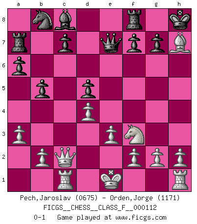 Last move : 0-1 2012 November 2 10:4:40 [Event "FICGS__CHESS__CLASS_F__000112"] [Site "FICGS"] [Date "2012.06.01"] [Round "1"] [White "Pech,Jaroslav"] [Black "Orden,Jorge"] [Result "0-1"] [WhiteElo "0675"] [BlackElo "1171"] 1.d4 d5 2.c4 e6 3.Nc3 Nf6 4.Bg5 Be7 5.Nf3 O-O 6.e3 a6 7.cxd5 Nxd5 8.Bxe7 Qxe7 9.Rc1 Qb4 10.Qc2 b5 11.a3 Qe7 12.Nxd5 exd5 13.Bd3 Ra7 14.Bxh7+ Kh8 0-1 This chess game has been lost on time (started : 2012.06.01 18:58:35) QGD : 4.Bg5 Be7 Kingside Castling by player Black (move 5) Player Black won this chess game. Follow this game move after move (download)I had a toothache during the first game. In the second game I had a headache. In the third game it was an attack of rheumatism. In the fourth game, I wasn't feeling well. And in the fifth game? Well, must one have to win every game ? (Siegbert Tarrasch) Über Kasparov: Es ist offensichtlich, daß er in einem totalitären Staat aufwuchs und deshalb zu diktatorischen Zügen neigt. (Viktor Kortschnoi) Diferente gente reacciona diferentemente en aceptar la derrota. (Bobby Fischer) Il n'y a plus de joueurs du niveau de Jacob Murray dont la seule quête est le beau jeu, le plaisir de voir les pièces construire quelque chose. Sur 10 idées à la minute, 9 seront sans intérêt, la dernière s'avèrera géniale. (Christian Bauer) History is a gallery of pictures in which there are few originals and many copies. (Alexis de Tocqueville)