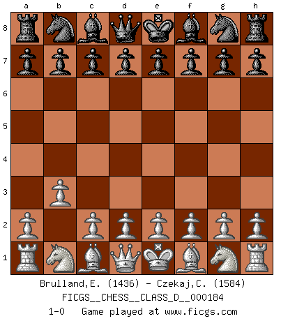 Last move : 1-0 2012 September 12 18:24:45 [Event "FICGS__CHESS__CLASS_D__000184"] [Site "FICGS"] [Date "2012.06.02"] [Round "1"] [White "Brulland,Emmanuel"] [Black "Czekaj,Christophe"] [Result "1-0"] [WhiteElo "1436"] [BlackElo "1584"] 1.b3 1-0 This chess game has been lost on time (started : 2012.06.02 5:49:1) Nimzovich-Larsen attack Player White won this chess game. Follow this game move after move (download)Many Chess players were surprised when after the game, Fischer quietly explained: 'I had already analyzed this possibility' in a position which I thought was not possible to foresee from the opening. (Mikhail Tal) Die größte Kunst beim Schach besteht darin dem Gegner nicht zu zeigen was er tun kann. (Garry Kasparov) El Ajedrez es 99 por ciento táctica. (Teichmann) Le jeu d'échecs est comme rejeté hors du temps. (Antoine de Saint-Exupéry) When you've done things right people won't know you've done anything at all. (Futurama)