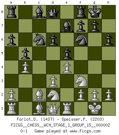 Last move : 0-1 2007 March 23 13:57:1 [Event "FICGS__CHESS__WCH_STAGE_1_GROUP_15__000002"] [Site "FICGS"] [Date "2007.01.16"] [Round "1"] [White "Forlot,Dominique"] [Black "Speisser,Patrick"] [Result "0-1"] [WhiteElo "1437"] [BlackElo "2203"] 1.e4 e5 2.Nf3 Nc6 3.Bb5 a6 4.Ba4 Nf6 5.O-O Be7 6.d3 d6 7.Re1 O-O 8.c3 b5 9.Bb3 h6 10.Nbd2 Na5 11.Bc2 c5 12.b4 cxb4 13.cxb4 Nc6 0-1 This chess game has been lost on time (started : 2007.01.16 15:26:24) Ruy Lopez : Closed defense Kingside Castling by player White (move 5) Kingside Castling by player Black (move 7) Player Black won this chess game. Follow this game move after move (download)An attack on the wing should be met by play in the center. (Nimzovitch) Garry Kasparov war erst in der Großmeister-Organisation GMA, dann in der Profischach-Vereinigung PCA, zum Schluss kehrte er wieder in den Schoß der FIDE zurück. Aber gut, manche Leute sind flexibel (Viswanathan Anand) De todos mis libros Rusos, la defensa contiene y difunde el 'calor' mas grande que pudiese verse extraño al observar lo supremamente abstracto que el Ajedrez supuestamente es. (Vladimir Nabokov) Un journaliste : 'Vous préférez avoir une dame de plus sur l'échiquier ou au lit ?' Boris Spassky : 'Ca dépend de la position.' Every vice is only an exaggeration of a necessary and virtuous function. (Ralph Waldo Emerson, Journals 1936)