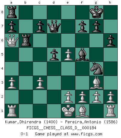 Last move : 0-1 2013 January 16 12:29:42 [Event "FICGS__CHESS__CLASS_D__000184"] [Site "FICGS"] [Date "2012.06.02"] [Round "1"] [White "Kumar,Dhirendra"] [Black "Pereira,Antonio"] [Result "0-1"] [WhiteElo "1400"] [BlackElo "1586"] 1.d4 d5 2.c4 e6 3.cxd5 exd5 4.Nc3 Nf6 5.Nf3 Nc6 6.Bg5 Bb4 7.a3 Bxc3+ 8.bxc3 h6 9.Bh4 Bf5 10.Qa4 O-O 11.Ne5 Nxe5 12.dxe5 Qd7 13.Qb3 Ng4 14.Bg3 Rfe8 15.Qxb7 Reb8 16.Qa6 Rb6 0-1 This chess game has been lost on time (started : 2012.06.02 5:49:1) Queen's gambit declined Kingside Castling by player Black (move 10) Player Black won this chess game. Follow this game move after move (download)I have never in my life played the French Defence, which is the dullest of all openings. (Wilhelm Steinitz) Kann Schach nicht schließlich das Nationalspiel der Deutschen werden? Und welche weiteren Ausblicke bieten sich dann dar! Welche Hebung des allgemeinen Kultur-Niveaus, ja der Moral, wenn das Schachbrett den Kartentisch verdrängen würde! Wahrlich, ein Ziel, des Schweißes der Edlen wert! (Siegbert Tarrasch) Si yo gano un torneo, yo lo gano por mí mismo. Yo hago las jugadas. Nadie me ayuda. (Bobby Fischer) Les échecs, c'est l'imagination. (David Bronstein) If computers get too powerful, we can organize them into committees. That'll do them in. (Anonymous)