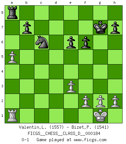 Last move : 0-1 2012 October 30 11:13:57 [Event "FICGS__CHESS__CLASS_D__000184"] [Site "FICGS"] [Date "2012.06.02"] [Round "1"] [White "Valentin,Laurentiu"] [Black "Bizet,Patrick"] [Result "0-1"] [WhiteElo "1557"] [BlackElo "1541"] 1.d4 Nf6 2.c4 e6 3.Nc3 Bb4 4.Bg5 d5 5.e3 O-O 6.Nf3 Nbd7 7.a3 Bxc3+ 8.bxc3 c5 9.cxd5 cxd4 10.Qxd4 exd5 11.c4 Qa5+ 12.Nd2 dxc4 13.Bxc4 Ne5 14.Bxf6 gxf6 15.O-O Rd8 16.Qf4 Rxd2 17.Bb3 Qb6 18.Rfb1 Qc6 19.Rc1 Qd6 20.Rd1 Kg7 21.Rxd2 Qxd2 22.Rd1 Qc3 23.Qa4 Bd7 24.Qb4 Qxb4 25.axb4 a5 26.bxa5 Be6 27.Bxe6 fxe6 28.Ra1 Nc6 0-1 Nimzo-Indian : Leningrad variation Kingside Castling by player Black (move 5) Kingside Castling by player White (move 15) Player Black won this chess game. Follow this game move after move (download)Chess opens and enriches your mind. (Saudin Robovic) Ich hatte Angst gegen einen russischen Großmeister zu verlieren, und er befürchtete gegen einen kleinen Jungen zu verlieren. (über ein Remis gegen Juri Awerbach). (Robert James Fischer) Puntos débiles o agujeros en la posición de tu oponente deben de ser ocupados por piezas, no Peones. (Siegbert Tarrasch) Des combinaisons [dans le jeu d'échecs] pareilles à des mélodies. Je crois entendre pour ainsi dire la musique des coups... (Vladimir Nabokov) Waiting for chance ? Play in casinos. (FICGS proverb)