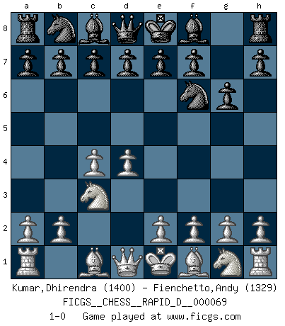 Last move : 1-0 2012 September 13 6:29:13 [Event "FICGS__CHESS__RAPID_D__000069"] [Site "FICGS"] [Date "2012.06.03"] [Round "1"] [White "Kumar,Dhirendra"] [Black "Fienchetto,Andy"] [Result "1-0"] [WhiteElo "1400"] [BlackElo "1329"] 1.d4 Nf6 2.c4 g6 3.Nc3 1-0 This chess game has been lost on time (started : 2012.06.03 22:36:14) King's Indian defense, 3.Nc3 Player White won this chess game. Follow this game move after move (download)After a bad opening, there is hope for the middle game. After a bad middle game, there is hope for the endgame. But once you are in the endgame, the moment of truth has arrived. (Edmar Mednis) Ein Schachspiel besteht aus drei Phasen: Die erste, wenn du hofftst den Vorteil zu haben, die zweite, wenn du glaubst einen Vorteil zu haben, und die dritte.... wenn du weißt Du wirst verlieren. (Savielly Grigorievitsch Tartakower) Muchos se han convertido en Maestros de Ajedrez, nadie se ha convertido en el Maestro del Ajedrez. (Siegbert Tarrasch) Mais n'est-ce pas déjà le limiter injurieusement que d'appeler les échecs un jeu? N'est-ce pas aussi une science, un art, ou quelque chose qui, comme le cercueil de Mahomet entre ciel et terre, est suspendu entre l'un et l'autre, et qui réunit un nombre incroyable de contraires ? (Stefan Zweig) Computers make it easier to do a lot of things, but most of the things they make it easier to do don't need to be done. (Andy Rooney)