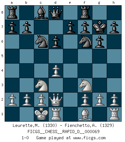 Last move : 1-0 2012 September 17 19:27:12 [Event "FICGS__CHESS__RAPID_D__000069"] [Site "FICGS"] [Date "2012.06.03"] [Round "1"] [White "Leurette,Marc-Antoine"] [Black "Fienchetto,Andy"] [Result "1-0"] [WhiteElo "1330"] [BlackElo "1329"] 1.e4 d6 2.d4 Nf6 3.Nc3 g6 4.e5 Nfd7 5.exd6 cxd6 6.Nf3 Bg7 7.Be3 O-O 8.Qd2 Nc6 9.Bh6 Nf6 10.Bxg7 Kxg7 11.O-O-O 1-0 This chess game has been lost on time (started : 2012.06.03 22:36:14) Pirc defense Kingside Castling by player Black (move 7) Queenside Castling by player White (move 11) Player White won this chess game. Follow this game move after move (download)If a ruler does not understand Chess, how can he rule over a kingdom ? (King Khusros II) Pläne sind die Träume des Verständigen. (Ernst Freiherr von Feuchtersleben) Nunca antes ha habido un jugador de Ajedrez con tal conocimiento a fondo de las complejidades del juego y una inmensa voluntad absolutamente indomable de ganar. Yo pienso que Fischer es el jugador mas grande que jamás haya existido. (Lisa Lane) Demandez au pauvre Cg1 ce qu'il en pense. Eduard Gufeld à propos de la variante Saemisch de l'Est-Indienne. Cactus - It is depressed cucumber. (Ilmars Cirulis)