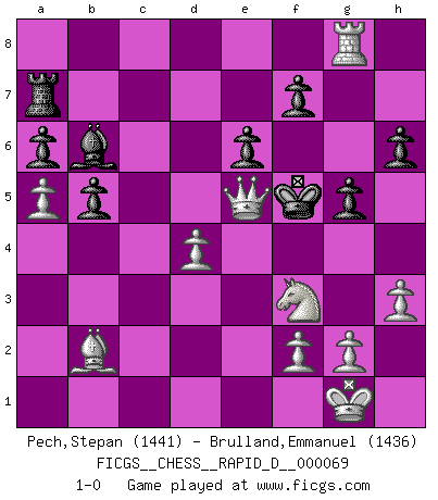Last move : 1-0 2012 October 15 3:10:30 [Event "FICGS__CHESS__RAPID_D__000069"] [Site "FICGS"] [Date "2012.06.03"] [Round "1"] [White "Pech,Stepan"] [Black "Brulland,Emmanuel"] [Result "1-0"] [WhiteElo "1441"] [BlackElo "1436"] 1.d4 d5 2.c4 c6 3.Nf3 e6 4.Nc3 Nf6 5.e3 Nbd7 6.Bd3 Be7 7.O-O O-O 8.b3 dxc4 9.bxc4 Re8 10.h3 Bf8 11.Qc2 g6 12.Bb2 Bg7 13.Rfd1 Nb6 14.Bf1 h6 15.e4 Qe7 16.a4 Nxc4 17.Bxc4 a6 18.a5 Qb4 19.e5 Qxc4 20.exf6 Bxf6 21.Ra4 Qxa4 22.Nxa4 b5 23.Nb6 Ra7 24.Qxc6 Bd8 25.Qxe8+ Kg7 26.Rc1 Bxb6 27.Rxc8 g5 28.Qh8+ Kg6 29.Rg8+ Kf5 30.Qe5+ 1-0 QGD Slav : 3.Nf3 Kingside Castling by player White (move 7) Kingside Castling by player Black (move 7) Player White won this chess game. Follow this game move after move (download)Life is a kind of Chess, with struggle, competition, good and ill events. (Benjamin Franklin) Ein bischen Romantik kann weder im Schach noch in der Liebe schaden. Also versuche ich mich ab und zu daran zu erinnern. (Nigel Short) El Ajedrez era la lengua materna de Capablanca. (Reti) Ce qui caractérise les parties de combat, c'est que si le défenseur a constamment de difficiles problèmes à résoudre, l'attaquant doit chercher sans relâche de nouvelles possibilités d'attaque. (Koblentz) A generalist learns less and less about more and more until he knows nothing about everything. (Author unknown)