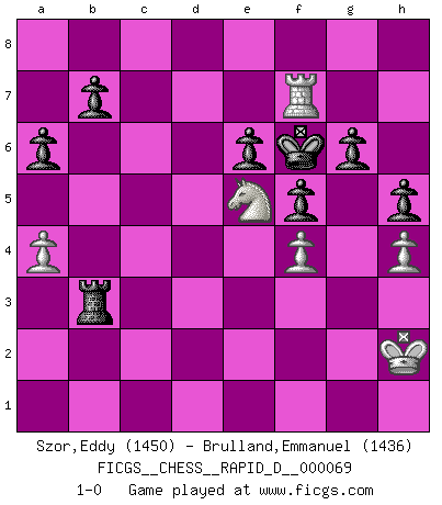Last move : 1-0 2012 September 3 21:5:35 [Event "FICGS__CHESS__RAPID_D__000069"] [Site "FICGS"] [Date "2012.06.03"] [Round "1"] [White "Szor,Eddy"] [Black "Brulland,Emmanuel"] [Result "1-0"] [WhiteElo "1450"] [BlackElo "1436"] 1.e4 c6 2.d4 d5 3.Nc3 e6 4.e5 a6 5.Nf3 c5 6.Bg5 Be7 7.Bxe7 Qxe7 8.Na4 cxd4 9.Qxd4 Nh6 10.Bd3 Nc6 11.Qc5 Qxc5 12.Nxc5 Ng4 13.h3 Ngxe5 14.Nxe5 Nxe5 15.O-O Nxd3 16.Nxd3 O-O 17.f4 f5 18.Rfe1 Re8 19.Ne5 Re7 20.Rac1 Rc7 21.a4 g6 22.h4 Kg7 23.Kh2 Kf6 24.c3 Bd7 25.b3 Rac8 26.c4 dxc4 27.Nxc4 Bc6 28.Nb6 Rd8 29.Nc4 Be4 30.Rcd1 Rcd7 31.Rxd7 Rxd7 32.Nb6 Rd2 33.Rg1 Rb2 34.Nd7+ Ke7 35.Ne5 Bxg2 36.Rxg2 Rxb3 37.Rc2 Kf6 38.Rc7 h5 39.Rf7+ 1-0 Caro-Kann defense Kingside Castling by player White (move 15) Kingside Castling by player Black (move 16) Player White won this chess game. Follow this game move after move (download)Chess is not like life... it has rules ! (Mark Pasternak) Man wirke der falschen Auffassung entgegen, als ob jeder Zug Unmittelbares zu leisten habe; auch Werte- und Ruhezüge haben ihre Existenzberechtigung. (Aaron Nimzowitsch) En el Ajedrez, cuando menos, el valiente hereda la tierra. (Edmar Mednis) Un footballeur joue avec ses pieds, parfois avec sa tête. Un joueur d'échecs ne joue qu'avec sa tête. Et quand il ne joue plus, il meurt. (Jacob Murray) You have to believe in yourself. (Sun Tzu)