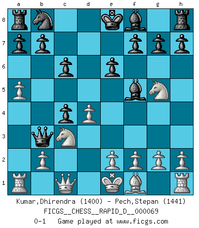 Last move : 0-1 2012 November 6 10:19:40 [Event "FICGS__CHESS__RAPID_D__000069"] [Site "FICGS"] [Date "2012.06.03"] [Round "1"] [White "Kumar,Dhirendra"] [Black "Pech,Stepan"] [Result "0-1"] [WhiteElo "1400"] [BlackElo "1441"] 1.d4 d5 2.c4 c6 3.Nc3 Nf6 4.Nf3 dxc4 5.a4 Bf5 6.Bg5 Qb6 7.Qd2 Ne4 8.a5 Qb3 9.Qc1 Nxg5 10.Nxg5 e6 0-1 This chess game has been lost on time (started : 2012.06.03 22:36:14) QGD Slav defense Player Black won this chess game. Follow this game move after move (download)If one piece is badly posted, the whole game is bad. (Tarrasch) Den Ruhm habe ich schon, jetzt brauche ich noch das Geld. (Wilhelm Steinitz) El Ajedrez es el gimnasio de la mente. (Blaise Pascal) Les échecs sont plus proches de l'art de l'assassinat que de l'art de la guerre. (Arturo Perez-Reverte) Happy endings are just stories that haven't finished yet. (Jane Smith in Mr & Mrs Smith)