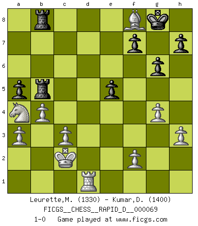Last move : 1-0 2012 October 21 10:17:25 [Event "FICGS__CHESS__RAPID_D__000069"] [Site "FICGS"] [Date "2012.06.03"] [Round "1"] [White "Leurette,Marc-Antoine"] [Black "Kumar,Dhirendra"] [Result "1-0"] [WhiteElo "1330"] [BlackElo "1400"] 1.e4 c5 2.Nc3 Nc6 3.Nf3 d6 4.d4 cxd4 5.Nxd4 a6 6.Be3 Nf6 7.Qf3 g6 8.O-O-O Bg7 9.Bc4 O-O 10.Nxc6 bxc6 11.e5 Bg4 12.Qxc6 Bxd1 13.Rxd1 Ne8 14.exd6 Nxd6 15.Bc5 Rc8 16.Qd5 Nxc4 17.Qxc4 Qc7 18.Na4 Qa5 19.Qb4 Qxb4 20.Bxb4 Rfe8 21.h3 Rb8 22.a3 a5 23.Bc5 Rb5 24.g4 Reb8 25.c3 e6 26.Kc2 e5 27.b4 Bf8 28.Bxf8 1-0 This chess game has been lost on time (started : 2012.06.03 22:36:14) Sicilian : Closed, 2...Nc6 Queenside Castling by player White (move 8) Kingside Castling by player Black (move 9) Player White won this chess game. Follow this game move after move (download)Spassky will not be psyched out by Fischer. (Mike Goodall) Ich spiele ehrlich und spiele, um zu gewinnen. Wenn ich verliere nehme ich meine Medizin. (Robert James Fischer) El juego de Fischer siempre fue nítido, racional y brillante. Uno de los mejores por siempre. (Dave Regis) A chaque perte on perd un peu de soi. (Joël Lautier) Political correctness is subjecting us to gross incompetence. (Johann Piek)