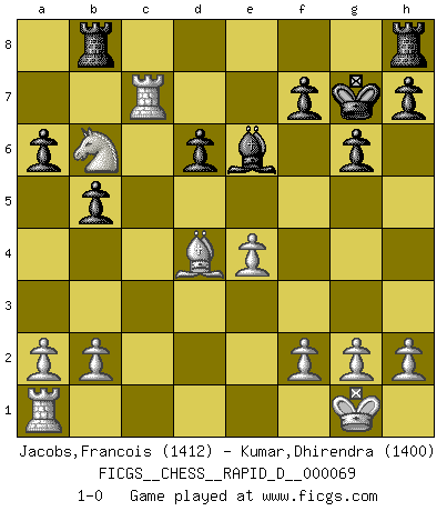 Last move : 1-0 2012 October 30 21:54:10 [Event "FICGS__CHESS__RAPID_D__000069"] [Site "FICGS"] [Date "2012.06.03"] [Round "1"] [White "Jacobs,Francois"] [Black "Kumar,Dhirendra"] [Result "1-0"] [WhiteElo "1412"] [BlackElo "1400"] 1.e4 c5 2.Nf3 d6 3.c3 Nc6 4.d4 cxd4 5.cxd4 Nf6 6.Nc3 Bg4 7.d5 Ne5 8.Nxe5 Bxd1 9.Bb5+ Nd7 10.Bxd7+ Qxd7 11.Nxd7 Bg4 12.Nxf8 Kxf8 13.O-O g6 14.Be3 a6 15.Na4 b5 16.Nb6 Rb8 17.Rfc1 Kg7 18.Rc7 e6 19.dxe6 Bxe6 20.Bd4+ 1-0 This chess game has been lost on time (started : 2012.06.03 22:36:14) Sicilian Kingside Castling by player White (move 13) Player White won this chess game. Follow this game move after move (download)The tactician must know what to do whenever something needs doing; the strategist must know what to do when nothing needs doing. (Savielly Tartakover) Oft bringt ein stiller Zug das Erdbeben. (Richard Reti) Uno no tiene que jugar muy bien, es suficiente jugar mejor que el oponente. (Siegbert Tarrasch) Soyez une menace à chaque fois que vous vous asseyez pour jouer. (Ken Smith) A shortcut is the longest distance between two points. (Don Groves)