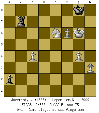 Last move : 0-1 2013 May 27 14:3:38 [Event "FICGS__CHESS__CLASS_B__000175"] [Site "FICGS"] [Date "2012.06.04"] [Round "1"] [White "Jozefini,Lubor"] [Black "Leperlier,Gabriel"] [Result "0-1"] [WhiteElo "1926"] [BlackElo "1900"] 1.e4 e5 2.Nf3 Nf6 3.Nxe5 d6 4.Nf3 Nxe4 5.Nc3 Nxc3 6.dxc3 Be7 7.Be3 O-O 8.h3 c5 9.Bd3 Nc6 10.O-O Be6 11.Re1 d5 12.a3 Re8 13.b4 Bf6 14.b5 Na5 15.Bxc5 Bxc3 16.Bxh7+ Kh8 17.Bd3 Qf6 18.Ne5 Nc4 19.Bb4 Bxe1 20.Qh5+ Qh6 21.Qxh6+ gxh6 22.Rxe1 Rad8 23.Bc3 Kg8 24.f4 d4 25.Ba1 Ne3 26.g4 Rc8 27.Re2 Red8 28.Kf2 Nd1+ 29.Kg3 Nc3 30.Re1 Rc5 31.a4 Nxa4 32.f5 Ba2 33.Nf3 Nc3 34.Re7 Bc4 35.Bxc4 Rxc4 36.Ne5 Nd5 37.Rxf7 Ra4 38.Bxd4 Rxd4 39.Rxb7 Re8 40.Nf7 Re3+ 41.Kh4 Re7 42.Nxh6+ Kh7 43.Rxe7+ Nxe7 44.Kg5 Rb4 45.Nf7 Rxb5 46.Nd8 a5 47.c4 Rb8 48.Ne6 a4 49.f6 Ng6 50.Kf5 a3 51.Ng5+ Kg8 52.Kxg6 a2 53.Ne6 Rb7 0-1 Petrov : Nimzovich attack Kingside Castling by player Black (move 7) Kingside Castling by player White (move 10) 10 pieces endgame at move 45 : White KNPPPP , Black KRNP WHITE : King + 1 Knight 4 Pawns BLACK : King + 1 Rook 1 Knight 1 Pawn 9 pieces endgame at move 52 : White KNPPPP , Black KRP WHITE : King + 1 Knight 4 Pawns BLACK : King + 1 Rook 1 Pawn Player Black won this chess game. Follow this game move after move (download)I played Chess with him and would have beaten him sometimes only he always took back his last move, and ran the game out differently. (Mark Twain) Wenn Du einsam bist, wenn Du Dich in der Welt wie ein Fremder fühlst, spiele Schach. Das wird Deinen Geist erheben und Dein Ratgeber im Kampf sein. (Aristoteles) La enorme capacidad mental, en la que sin ella no puede un jugador de Ajedrez existir, es demasiado requerida por el Ajedrez al grado de que nunca podrá liberar su mente de este juego. (Albert Einstein) On peut tirer plus d'utilité d'une partie perdue que de 100 parties gagnées. (Capablanca) Establishing goals is all right if you don't let them deprive you of interesting detours. (Doug Larson)