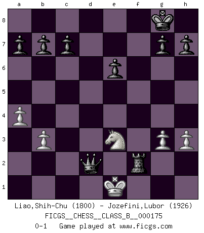 Last move : 0-1 2012 November 19 14:47:43 [Event "FICGS__CHESS__CLASS_B__000175"] [Site "FICGS"] [Date "2012.06.04"] [Round "1"] [White "Liao,Shih-Chu"] [Black "Jozefini,Lubor"] [Result "0-1"] [WhiteElo "1800"] [BlackElo "1926"] 1.e4 e5 2.Nf3 Nc6 3.b3 Bc5 4.d3 Nf6 5.h3 d5 6.Bg5 Bxf2+ 7.Kxf2 dxe4 8.Nh2 Qd4+ 9.Ke1 Qxa1 10.a4 exd3 11.Bxd3 e4 12.Bc4 Be6 13.Bxe6 fxe6 14.Rf1 O-O 15.Bxf6 Rxf6 16.Rxf6 Qxf6 17.g3 Rf8 18.Qe2 Qb2 19.Qd1 Nd4 20.Nd2 e3 21.Nc4 Qc3+ 22.Nd2 Rf2 23.Nhf1 Nxc2+ 24.Qxc2 Qxc2 25.Nxe3 Qxd2+ 0-1 King's pawn game Kingside Castling by player Black (move 14) Player Black won this chess game. Follow this game move after move (download)I prefer to lose a really good game than to win a bad one. (David Levy) Schach ist Krieg, im Schach geht es um testosterongesteuerte Urschreie. (Garry Kasparov) La vida es como un juego de Ajedrez, cambiando con cada movimiento. (Proverbio Chino) Les Echecs sont affaire de jugement sensible. Savoir quand frapper et quand esquiver. (Fischer) Animated gif is worth one mega-word. (Unknown)