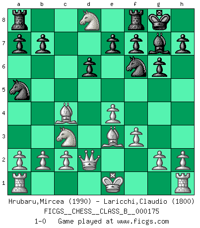 Last move : 1-0 2012 June 7 21:39:53 [Event "FICGS__CHESS__CLASS_B__000175"] [Site "FICGS"] [Date "2012.06.04"] [Round "1"] [White "Hrubaru,Mircea"] [Black "Laricchi,Claudio"] [Result "1-0"] [WhiteElo "1990"] [BlackElo "1800"] 1.e4 c5 2.Nf3 d6 3.d4 cxd4 4.Nxd4 Nf6 5.Nc3 g6 6.Be3 Bg7 7.f3 O-O 8.Qd2 Nc6 9.Bc4 Be6 10.Nxe6 Na5 11.Nxd8 1-0 Sicilian : Dragon, Yugoslav attack, 7...O-O Kingside Castling by player Black (move 7) Player White won this chess game. Follow this game move after move (download)The only thing Chess players have in common is Chess. (Lodewijk Prins) Frage: Wie viele Autos haben Sie schon zerstört? - Antwort: Nur zwei. (Loek van Wely) Repentinamente, me resultaba obvio en mi analisis que yo había pasado por alto lo que Fischer había visto en el tablero con la mas grande facilidad. (Mikhail Botvinnik) Soyez une menace à chaque fois que vous vous asseyez pour jouer. (Ken Smith) Chess, like love, like music, has the power to make people happy. (Siegbert Tarrasch)