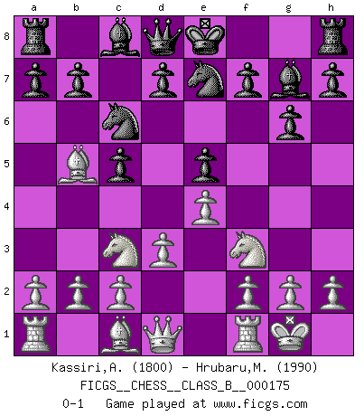 Last move : 0-1 2012 September 18 19:34:45 [Event "FICGS__CHESS__CLASS_B__000175"] [Site "FICGS"] [Date "2012.06.04"] [Round "1"] [White "Kassiri,Abdessamad"] [Black "Hrubaru,Mircea"] [Result "0-1"] [WhiteElo "1800"] [BlackElo "1990"] 1.e4 c5 2.Nf3 Nc6 3.Bb5 g6 4.Nc3 Bg7 5.O-O e5 6.d3 Nge7 0-1 This chess game has been lost on time (started : 2012.06.04 14:14:7) Sicilian : Nimzovich-Rossolimo attack (with ...g6, without ...d6) Kingside Castling by player White (move 5) Player Black won this chess game. Follow this game move after move (download)Of Chess it has been said that life is not long enough for it, but that is the fault of life, not Chess. (William Ewart Napier) Schach ist eine Sache der genauen Beurteilung, wann man zuschlagen und wann man sich ducken muss. (Robert James Fischer) ¿Esta Bobby Fischer algo cuerdo?. (Salo Flohr) Le succès, c'est être capable d'aller d'échec en échec sans perdre son enthousiasme. (Winston Churchill) A woman without a man is like a fish without a bicycle. (Gloria Steinem)