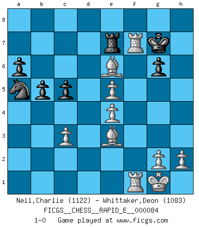 Last move : 1-0 2012 October 17 16:28:20 [Event "FICGS__CHESS__RAPID_E__000084"] [Site "FICGS"] [Date "2012.06.05"] [Round "1"] [White "Neil,Charlie"] [Black "Whittaker,Deon"] [Result "1-0"] [WhiteElo "1122"] [BlackElo "1083"] 1.d4 d5 2.c4 c6 3.Nc3 dxc4 4.a4 e5 5.dxe5 Qxd1+ 6.Nxd1 Bb4+ 7.Nc3 Ne7 8.e4 Be6 9.Bd2 Na6 10.Nf3 h6 11.Be2 O-O 12.O-O Kh7 13.Nd4 Rfd8 14.Be3 Ng6 15.f4 Rd7 16.f5 Bxc3 17.bxc3 c5 18.fxg6+ Kxg6 19.Nf3 Kh7 20.Nd2 g6 21.Nxc4 Bxc4 22.Bxc4 Re8 23.Bf4 Nb8 24.Bb5 Nc6 25.a5 a6 26.Ba4 Re6 27.Rad1 Rc7 28.Rd6 Nxa5 29.Rd7 Rc8 30.Rxf7+ Kg8 31.Bxh6 b5 32.Bd1 R8c6 33.Rf8+ Kh7 34.Be3 Rc7 35.Bg4 Rce7 36.Bxe6 Kg7 37.R8f7+ 1-0 QGD Slav defense Kingside Castling by player Black (move 11) Kingside Castling by player White (move 12) Player White won this chess game. Follow this game move after move (download)Chess is above all, a fight ! (Emanuel Lasker) Wenn Spassky eine Figur opfert kannst du genauso gut aufgeben. Aber wenn Tal eine Figur opfert, spiel weiter. Er könnte noch eine weitere opfern, und dann ... wer weiß? (Miguel Najdorf) Bendita sea la memoria de aquel que dio al mundo este juego inmortal. (A. G. Gardiner) Même un GMI sait rarement calculer sur plus de cinq coups une attaque à sacrifices. (Rudolf Spielmann) Logic : The art of thinking and reasoning in strict accordance with the limitations and incapacities of the human misunderstanding. (Ambrose Bierce)