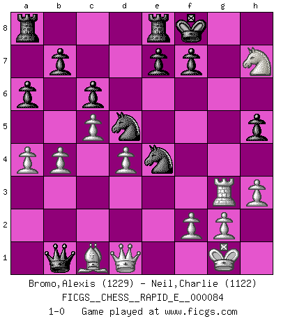 Last move : 1-0 2012 August 8 21:13:27 [Event "FICGS__CHESS__RAPID_E__000084"] [Site "FICGS"] [Date "2012.06.05"] [Round "1"] [White "Bromo,Alexis"] [Black "Neil,Charlie"] [Result "1-0"] [WhiteElo "1229"] [BlackElo "1122"] 1.d4 Nf6 2.c4 g6 3.Nc3 d5 4.e3 Bg7 5.Nf3 O-O 6.Bd3 c6 7.c5 a6 8.b4 Bg4 9.h3 Bd7 10.O-O Qc8 11.a4 h5 12.e4 dxe4 13.Nxe4 Bf5 14.Re1 Nbd7 15.Neg5 Nd5 16.Bxf5 gxf5 17.Nh4 Re8 18.Nxf5 N7f6 19.Nxg7 Kxg7 20.Ra3 Qf5 21.Rg3 Kf8 22.Re5 Qb1 23.Re4 Nxe4 24.Nh7+ 1-0 King's Indian defense, 3.Nc3 Kingside Castling by player Black (move 5) Kingside Castling by player White (move 10) Player White won this chess game. Follow this game move after move (download)There are two types of sacrifices: correct ones and mine. (Mikhail Tal) Im Reiche der Wirklichkeit ist man nie so glücklich wie im Reiche der Gedanken. (Arthur Schopenhauer) Por tratar de evitar la pérdida de una pieza, muchas personas han perdido una partida de Ajedrez. (Savielly Tartakover) Les échecs sont plus proches de l'art de l'assassinat que de l'art de la guerre. (Arturo Perez-Reverte) The right perception of any matter and a misunderstanding of the same matter do not wholly exclude each other. (Kafka's the trial)