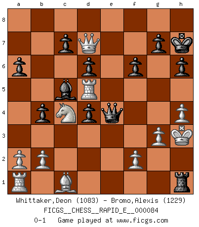 Last move : 0-1 2012 August 24 17:57:41 [Event "FICGS__CHESS__RAPID_E__000084"] [Site "FICGS"] [Date "2012.06.05"] [Round "1"] [White "Whittaker,Deon"] [Black "Bromo,Alexis"] [Result "0-1"] [WhiteElo "1083"] [BlackElo "1229"] 1.e4 e5 2.Nf3 Nc6 3.Bc4 h6 4.c3 Bc5 5.Qb3 Qf6 6.d3 a6 7.Nbd2 b5 8.d4 exd4 9.Bd5 Bb7 10.c4 b4 11.O-O Nge7 12.g3 O-O 13.Qd3 Rfe8 14.Re1 Nxd5 15.cxd5 Ne5 16.Nxe5 Rxe5 17.Nc4 Re7 18.e5 Rxe5 19.Rxe5 d6 20.Rf5 Qg6 21.Qe4 f6 22.Qe6+ Kh7 23.h4 Re8 24.Qd7 Re1+ 25.Kg2 Bxd5+ 26.Rxd5 Qe4+ 27.Kh3 Rh1+ 0-1 King's pawn game Kingside Castling by player White (move 11) Kingside Castling by player Black (move 12) Player Black won this chess game. Follow this game move after move (download)You know you're going to lose. Even when I was ahead I knew I was going to lose. - On playing against Fischer. (Andrew Soltis) In Buenos Aires ist es nicht mein vorrangiges Ziel ein starkes Turnier zu organisieren, sondern ein Turnier für Gentlemen. Ich würde nie Kamsky einladen. Ich mag keine Probleme. (Miguel Najdorf) Cada Peón es potencialmente una Reina. (James Mason) Comme les marins qui ont mille raisons différentes d'aller en mer, les joueurs d'échecs en ont tout autant avant de s'installer devant une table et jouer... (Vincent Bertignac, philosophe) The man who strikes first admits that his ideas have given out. (Chinese proverb)