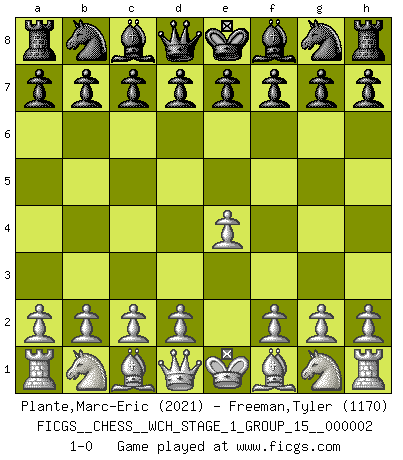 Last move : 1-0 2007 February 15 16:26:34 [Event "FICGS__CHESS__WCH_STAGE_1_GROUP_15__000002"] [Site "FICGS"] [Date "2007.01.16"] [Round "1"] [White "Plante,Marc-Eric"] [Black "Freeman,Tyler"] [Result "1-0"] [WhiteElo "2021"] [BlackElo "1170"] 1.e4 1-0 This chess game has been lost on time (started : 2007.01.16 15:26:24) King's pawn Opening Player White won this chess game. Follow this game move after move (download)The hallmark of the artist is simplicity. (Larry Evans) Bis zum Jahr 1971 verlief in meiner Schachkariere alles glatt. Dieses dramatische Match [Fischer-Taimanov 6:0] machte mein Leben zur Hölle. (Mark Taimanov) Solo existe una cosa que Fischer hace en el Ajedrez sin placer: ¡perder!. (Boris Spassky) Les échecs sont plus proches de l'art de l'assassinat que de l'art de la guerre. (Arturo Perez-Reverte) Experiences are the keys to life. (Daniel Parmet)