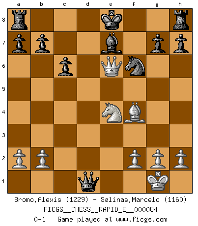 Last move : 0-1 2012 July 30 21:12:13 [Event "FICGS__CHESS__RAPID_E__000084"] [Site "FICGS"] [Date "2012.06.05"] [Round "1"] [White "Bromo,Alexis"] [Black "Salinas,Marcelo"] [Result "0-1"] [WhiteElo "1229"] [BlackElo "1160"] 1.d4 d5 2.c4 Bf5 3.Nc3 dxc4 4.e4 Bg6 5.Bxc4 Qd6 6.Nf3 Qb4 7.Bb5+ c6 8.Ba4 Bxe4 9.Bd2 Bxf3 10.Qxf3 Qd6 11.O-O Nd7 12.Bb3 Ngf6 13.Rfe1 Qxd4 14.Rad1 Ne5 15.Rxe5 Qxe5 16.Bf4 Qh5 17.Qe3 e6 18.Bxe6 fxe6 19.Qxe6+ Be7 20.Ne4 Qxd1+ 0-1 QGD : Grau (Sahovic) defense Kingside Castling by player White (move 11) Player Black won this chess game. Follow this game move after move (download)He who fears an isolated Queen's Pawn should give up Chess. (Siegbert Tarrasch) Wie, soll nun auch die Opposition abgeschafft werden? Ja, es tut mir leid, Ihnen diesen Schmerz nicht ersparen zu können. (Aaron Nimzowitsch) Me siento como si fuera una pieza en una partida de Ajedrez, cuando mi oponente me indica: esa pieza no puede ser movida. (Soren Kierkegaard) Il s'avisa de me proposer d'apprendre les échecs qu'il jouait un peu... me voilà forcené des échecs. J'achète un échiquier, je m'enferme dans ma chambre, j'y passe des jours et des nuits à vouloir apprendre par cur toutes les parties. (Jean-Jacques Rousseau, Confessions) Programming can only do so much before it becomes too much. (Don Groves)