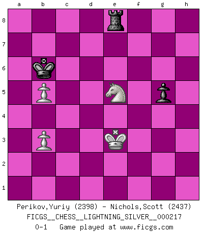 Last move : 0-1 2012 June 6 19:44:44 [Event "FICGS__CHESS__LIGHTNING_SILVER__000217"] [Site "FICGS"] [Date "2012.06.06"] [Round "1"] [White "Perikov,Yuriy"] [Black "Nichols,Scott"] [Result "0-1"] [WhiteElo "2398"] [BlackElo "2437"] 1.e4 c6 2.d4 d5 3.e5 c5 4.dxc5 e6 5.Be3 Ne7 6.Nf3 Nf5 7.Bg5 Qc7 8.Bd3 Bxc5 9.O-O h6 10.Bd2 a6 11.Bxf5 exf5 12.Be3 Bxe3 13.fxe3 Be6 14.Nc3 Qc5 15.Qd4 Qa5 16.Rad1 Nc6 17.Qf4 Rc8 18.Nd4 Nxd4 19.exd4 O-O 20.Rd3 Rc6 21.Qd2 Rfc8 22.a3 Rc4 23.Rg3 Kh8 24.Rd3 Qb6 25.b3 R4c6 26.Na4 Qd8 27.c3 b6 28.Rdf3 Qe7 29.Ra1 a5 30.Qd3 Qc7 31.Raf1 Bd7 32.Qe3 g5 33.g3 Rg6 34.Qd3 Qd8 35.Rxf5 Bxf5 36.Qxf5 Rc7 37.Qf3 Kg7 38.Nb2 f6 39.Nd1 fxe5 40.dxe5 Re6 41.Ne3 Rxe5 42.Ng4 Re6 43.Qf2 R7c6 44.Qd4+ Kg8 45.c4 h5 46.Ne5 Rc7 47.cxd5 Rd6 48.Rd1 b5 49.a4 Re7 50.axb5 Qe8 51.Nc6 Re1+ 52.Rxe1 Qxe1+ 53.Kg2 Rd7 54.d6 Qe2+ 55.Qf2 Qxf2+ 56.Kxf2 Rxd6 57.Ke3 Kf7 58.Ke4 Ke6 59.h3 Kf6 60.Nd4 Rd7 61.Nc6 Rb7 62.Nd4 Ke7 63.Kd5 Kd7 64.Kc4 Kc7 65.Kc5 Kc8 66.g4 hxg4 67.hxg4 Re7 68.Nf5 Re6 69.Kd4 Kb7 70.Ne3 Kb6 71.Nd5+ Ka7 72.Ne3 Rf6 73.Nc4 Rf4+ 74.Kd3 Rxg4 75.Nxa5 Rf4 76.Ke3 Kb6 77.Nc6 Rf8 78.Ne5 Re8 0-1 Caro-Kann : Advance variation Kingside Castling by player White (move 9) Kingside Castling by player Black (move 19) 10 pieces endgame at move 66 : White KNPPP , Black KRPPP WHITE : King + 1 Knight 3 Pawns BLACK : King + 1 Rook 3 Pawns 9 pieces endgame at move 67 : White KNPPP , Black KRPP WHITE : King + 1 Knight 3 Pawns BLACK : King + 1 Rook 2 Pawns 8 pieces endgame at move 74 : White KNPP , Black KRPP WHITE : King + 1 Knight 2 Pawns BLACK : King + 1 Rook 2 Pawns 7 pieces endgame at move 75 : White KNPP , Black KRP WHITE : King + 1 Knight 2 Pawns BLACK : King + 1 Rook 1 Pawn Player Black won this chess game. Follow this game move after move (download)Chess is in its essence a game, in its form an art, and in its execution a science. (Baron Tassilo) Der Traum, für den ich lebe, ist der von einem freien Russland. Viele mögen sagen: Russland hat doch ein Parlament, einen gewählten Präsidenten. Aber ich spüre, dass in meiner Heimat die Angst wiederkehrt. Eine Angst, sich frei zu äußern, bestimmte Dinge zu tun (Garry Kasparov) Los Peones son el alma de una partida de Ajedrez. (Francois Andre Danican Philidor) C'est la seule position que je connaisse où les deux camps sont mals. Propos prêtés à V. Anand. 98% of all statistics are made up. (Author unknown)