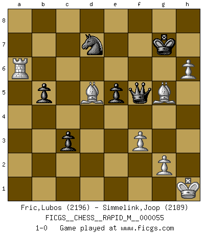Last move : 1-0 2012 November 7 1:46:6 [Event "FICGS__CHESS__RAPID_M__000055"] [Site "FICGS"] [Date "2012.06.06"] [Round "1"] [White "Fric,Lubos"] [Black "Simmelink,Joop"] [Result "1-0"] [WhiteElo "2196"] [BlackElo "2189"] 1.d4 d5 2.c4 c6 3.Nf3 Nf6 4.Nc3 e6 5.Bg5 dxc4 6.a4 Bb4 7.e4 Bxc3+ 8.bxc3 Qa5 9.e5 Ne4 10.Bd2 Qd5 11.Be3 O-O 12.Qc2 Bd7 13.Be2 c5 14.O-O cxd4 15.cxd4 Rc8 16.Rfb1 f5 17.exf6 gxf6 18.Nd2 Nxd2 19.Qxd2 Bc6 20.f3 a6 21.Qb4 b5 22.Qe7 Re8 23.Qxf6 Ra7 24.axb5 Rf7 25.Qh4 axb5 26.Bd1 Rg7 27.Kh1 Kh8 28.Bh6 Rg6 29.Ra2 Qd8 30.Qh3 Qf6 31.Bd2 Qxd4 32.Bc2 Rg7 33.Bh6 Rd7 34.Ra3 Qf6 35.Qh5 Rg8 36.h4 e5 37.Re3 Re7 38.Bg5 Qg7 39.Re2 Re6 40.Qg4 Bd7 41.Rd1 Rb6 42.Qe4 Re8 43.Red2 h6 44.Be3 Rf6 45.h5 Bf5 46.Qxf5 Rxf5 47.Bxf5 Rf8 48.Be4 c3 49.Rd6 Rf6 50.Rd8+ Rf8 51.R1d6 Qe7 52.Rxh6+ Kg8 53.Rxf8+ Qxf8 54.Bg5 Nd7 55.Bd5+ Kg7 56.Ra6 Qf5 57.h6+ 1-0 QGD Slav : 4.Nc3 Kingside Castling by player Black (move 11) Kingside Castling by player White (move 14) Player White won this chess game. Follow this game move after move (download)I like the moment when I break a man's ego. (Bobby Fischer) Ich habe Putins Aufstieg an die Macht beobachtet und seine Politik, die demokratischen Institutionen meines Landes zu zerstören. (Garry Kasparov) El Ajedrez es un mar en el cual un mosquito puede beber y un elefante puede bañarse. (Refrán Hindú) La vérité est comme le meilleur coup aux échecs : elle existe, mais il faut la chercher. (Arturo Perez-Reverte) When you stop learning you start dying. (Scott Adams)