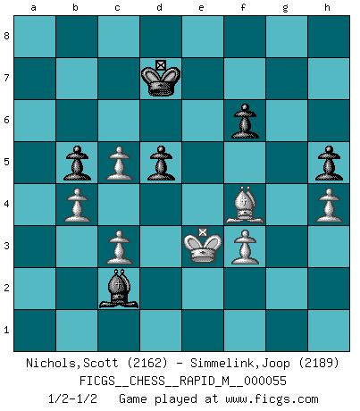 Last move : 1/2-1/2 2012 August 2 23:37:2 [Event "FICGS__CHESS__RAPID_M__000055"] [Site "FICGS"] [Date "2012.06.06"] [Round "1"] [White "Nichols,Scott"] [Black "Simmelink,Joop"] [Result "1/2-1/2"] [WhiteElo "2162"] [BlackElo "2189"] 1.e4 e5 2.Nf3 Nc6 3.Bb5 a6 4.Ba4 Nf6 5.O-O Be7 6.Re1 b5 7.Bb3 O-O 8.c3 d5 9.exd5 Nxd5 10.Nxe5 Nxe5 11.Rxe5 c6 12.g3 Bf6 13.Re1 Bf5 14.d4 Qd7 15.Na3 a5 16.Nc2 a4 17.Bxd5 cxd5 18.Bf4 g5 19.Bd2 Be4 20.Nb4 Rfe8 21.f3 Bg6 22.Rxe8+ Rxe8 23.Qf1 Be7 24.Nd3 f6 25.Re1 a3 26.b4 Bd6 27.Nc5 Rxe1 28.Nxd7 Rxf1+ 29.Kxf1 Kf7 30.Ke2 Bb1 31.Bc1 Bxa2 32.Bxa3 h5 33.Bc1 Ke6 34.Nc5+ Bxc5 35.dxc5 Bb1 36.Be3 Bf5 37.h4 gxh4 38.gxh4 Bc2 39.Bf4 Kd7 40.Ke3 1/2-1/2 Ruy Lopez : Closed, 7...O-O Kingside Castling by player White (move 5) Kingside Castling by player Black (move 7) This chess game ended in a draw. Follow this game move after move (download)Fischer is under obligation to nobody. (Joseph Platz) Je älter ich werde, um so mehr schätze ich die Bauern. (Paul Keres) Nunca nadie ha ganado una partida de Ajedrez rindiendose. (Unknown) Mon pion favori sur ma case favorite ! Bronstein en parlant d'un coup de pion en h5 quand il avait les Noirs. I'm extremely disappointed. I send you out for exciting, new designer drugs, you come back with tomato sauce. (Gregory House, House M.D.)