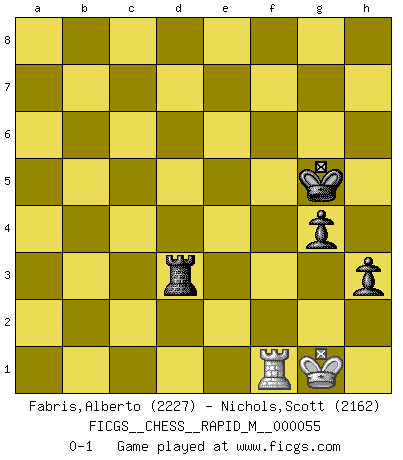 Last move : 0-1 2012 October 13 11:47:37 [Event "FICGS__CHESS__RAPID_M__000055"] [Site "FICGS"] [Date "2012.06.06"] [Round "1"] [White "Fabris,Alberto"] [Black "Nichols,Scott"] [Result "0-1"] [WhiteElo "2227"] [BlackElo "2162"] 1.c4 e5 2.g3 Nf6 3.Bg2 d5 4.cxd5 Nxd5 5.Nc3 Nf6 6.Nf3 Nc6 7.O-O h6 8.d3 Bd6 9.a3 O-O 10.b4 Re8 11.Bb2 Be6 12.Rc1 Qd7 13.Re1 a5 14.b5 Nd4 15.Nxd4 exd4 16.Nb1 Qxb5 17.Bxd4 Ng4 18.h3 Ne5 19.a4 Qb4 20.Bc3 Qb6 21.Nd2 Nc6 22.e3 Bf8 23.Qh5 Nb4 24.Bd4 c5 25.Bxc5 Bxc5 26.Rxc5 Nxd3 27.Rb5 Qc7 28.Reb1 Rab8 29.Rxb7 Rxb7 30.Rxb7 Qc1+ 31.Nf1 Qc2 32.Qf3 Rd8 33.Ra7 Bd5 34.e4 Ne1 35.Qf4 Nxg2 36.Kxg2 Bxe4+ 37.Kh2 f5 38.g4 Rf8 39.Qd2 fxg4 40.Qxc2 Bxc2 41.Rxa5 Rxf2+ 42.Kg1 Re2 43.Ng3 Re3 44.Kf2 Rf3+ 45.Kg2 Rf4 46.Ra8 Kh7 47.a5 Bd1 48.Ra7 Bf3+ 49.Kh2 gxh3 50.Kxh3 Kg6 51.Rc7 Ra4 52.Rc5 h5 53.Nf1 Ra3 54.Kg3 Be2 55.Kf2 Bxf1 56.Kxf1 h4 57.Kg2 Kh6 58.Rc6 Kh5 59.a6 g5 60.Rb6 h3+ 61.Kh2 Kh4 62.Rb4 g4 63.a7 Ra2+ 64.Kg1 Rxa7 65.Rc4 Rd7 66.Ra4 Rd3 67.Rb4 Kg3 68.Rb1 Kf4 69.Rf1 Kg5 0-1 English Opening Kingside Castling by player White (move 7) Kingside Castling by player Black (move 9) 10 pieces endgame at move 49 : White KRNP , Black KRBPPP WHITE : King + 1 Rook 1 Knight 1 Pawn BLACK : King + 1 Rook 1 Bishop 3 Pawns 9 pieces endgame at move 50 : White KRNP , Black KRBPP WHITE : King + 1 Rook 1 Knight 1 Pawn BLACK : King + 1 Rook 1 Bishop 2 Pawns 8 pieces endgame at move 55 : White KRP , Black KRBPP WHITE : King + 1 Rook 1 Pawn BLACK : King + 1 Rook 1 Bishop 2 Pawns 7 pieces endgame at move 56 : White KRP , Black KRPP WHITE : King + 1 Rook 1 Pawn BLACK : King + 1 Rook 2 Pawns 6 pieces endgame at move 64 : White KR , Black KRPP WHITE : King + 1 Rook BLACK : King + 1 Rook 2 Pawns Player Black won this chess game. Follow this game move after move (download)Human affairs are like a Chess game: only those who do not take it seriously can be called good players. (Hung Tzu Ch'eng) Es hat in meinem Leben Zeiten gegeben, in denen das Schachspiel, wenn nicht zum Lebenszweck, so doch zu einem regelrechten Lebensersatz geworden ist. Man fühlt sich in solchen Zeiten nicht so, als besäße man eine göttliche Gabe, sondern eher so, als sei man von ihr besessen. (Garry Kasparov) Una compensación adecuada por un sacrificio es tener una combinación sólida que conduce a una posición ganadora; una compensación adecuada por una metida de pata es dejar a tu oponente arrebatar una derrota de las fauces de la victoria. (Bruce A. Moon) Dieu déplace le joueur, et celui-ci la pièce. Quel Dieu derrière Dieu commence donc la trame ? Arturo Perez-Reverte (prix de littérature policière 1993). What doesn't kill us makes us stronger. (Friedrich Nietzsche)