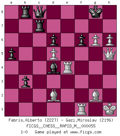 Last move : 1-0 2012 December 9 10:42:47 [Event "FICGS__CHESS__RAPID_M__000055"] [Site "FICGS"] [Date "2012.06.06"] [Round "1"] [White "Fabris,Alberto"] [Black "Gazi,Miroslav"] [Result "1-0"] [WhiteElo "2227"] [BlackElo "2196"] 1.c4 e5 2.g3 Nf6 3.Bg2 Bc5 4.Nc3 O-O 5.e3 d6 6.Nge2 a6 7.O-O Nc6 8.d4 Ba7 9.h3 Bd7 10.b3 Rb8 11.a4 Re8 12.Kh2 Bf5 13.d5 Nb4 14.e4 Bc8 15.g4 a5 16.Rb1 h5 17.g5 Nd7 18.f4 g6 19.f5 Nf8 20.h4 c6 21.Ng3 Re7 22.Bd2 Rc7 23.Nce2 Bc5 24.Nxh5 gxh5 25.Ng3 Nh7 26.Qxh5 Bd4 27.Rf3 Qf8 28.Rbf1 b5 29.axb5 cxb5 30.g6 Nf6 31.Qg5 Qg7 32.h5 bxc4 33.Kh1 Nbxd5 34.exd5 e4 35.Rf4 cxb3 36.h6 Qf8 37.Nxe4 Nxe4 38.Rxe4 f6 39.Qh5 Bxf5 40.Qxf5 Qc8 41.Qh5 1-0 English Opening Kingside Castling by player Black (move 4) Kingside Castling by player White (move 7) Player White won this chess game. Follow this game move after move (download)You cannot play at Chess if you are kind-hearted. (French Proverb) Alles was ich jemals tun will ist Schach spielen. (Robert James Fischer) A través de las casillas del tablero, los Indios explican el movimiento del tiempo y la edad, las influencias mas altas que controlan el mundo y los lazos que vinculan al Ajedrez con el alma humana. (Al-Masudi) Des idées, des idées, j'en ai cent, j'en ai mille. Des bonnes, des mauvaises, applicables, irréalisables... Il suffit de faire le tri ! (Roos) If you lose the game you should win the analysis! (Proverb)