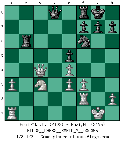 Last move : 1/2-1/2 2012 September 9 21:41:35 [Event "FICGS__CHESS__RAPID_M__000055"] [Site "FICGS"] [Date "2012.06.06"] [Round "1"] [White "Proietti,Costantino"] [Black "Gazi,Miroslav"] [Result "1/2-1/2"] [WhiteElo "2102"] [BlackElo "2196"] 1.d4 Nf6 2.c4 e6 3.Nf3 d5 4.Nc3 Bb4 5.Qa4+ Nc6 6.e3 O-O 7.Bd2 dxc4 8.Bxc4 Bd6 9.a3 e5 10.d5 Ne7 11.e4 c6 12.dxc6 Nxc6 13.Be3 Bg4 14.Be2 Rc8 15.O-O Bxf3 16.Bxf3 Nd4 17.Qxa7 Bc5 18.Qxb7 Rb8 19.Qa6 Nxf3+ 20.gxf3 Bxe3 21.fxe3 Rxb2 22.Rf2 Rb6 23.Qc4 1/2-1/2 Queen's pawn game Kingside Castling by player Black (move 6) Kingside Castling by player White (move 15) This chess game ended in a draw. Follow this game move after move (download)There are tough players and nice guys, and I'm a tough player. (Bobby Fischer) Der beste Spieler in einem Turnier gewinnt es nie. Er landet auf Platz zwei oder drei. (Siegbert Tarrasch) Un buen sacrificio es aquel que aunque no sea necesariamente sólido, deja a tu oponente aturdido y confuso. (Rudolph Spielmann) J'ai toujours senti une vague pitié pour l'homme qui ne connaît rien aux échecs, tout comme j'en aurais pour un homme ignorant de l'amour. Les Echecs, comme la musique ou comme l'amour, ont le pouvoir de rendre heureux. (Siegbert Tarrasch) Life is like a game of cards: the hand you are dealt represents determinism; the way you play it is free will. (Jawaharlal Nehru)